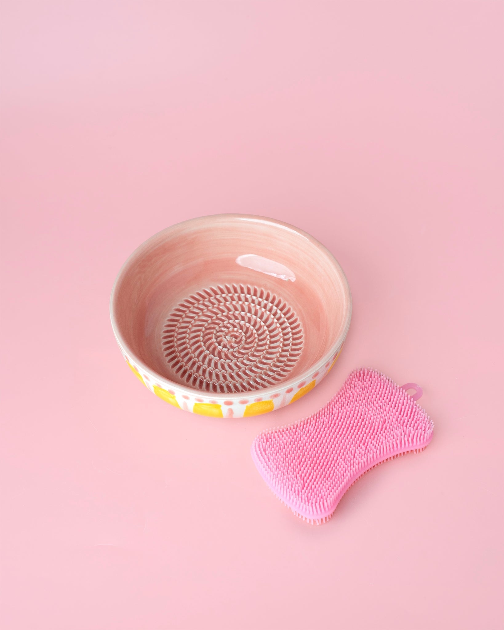 Diseñado con suaves cerdas de silicona, limpia eficazmente sin rayar, y se enjuaga con facilidad para secarse rápidamente. Ideal para limpiar tu rallador cerámico artesanal después de usarlo con ajo, jengibre, tomate o limón, sin dañar su superficie esmaltada.