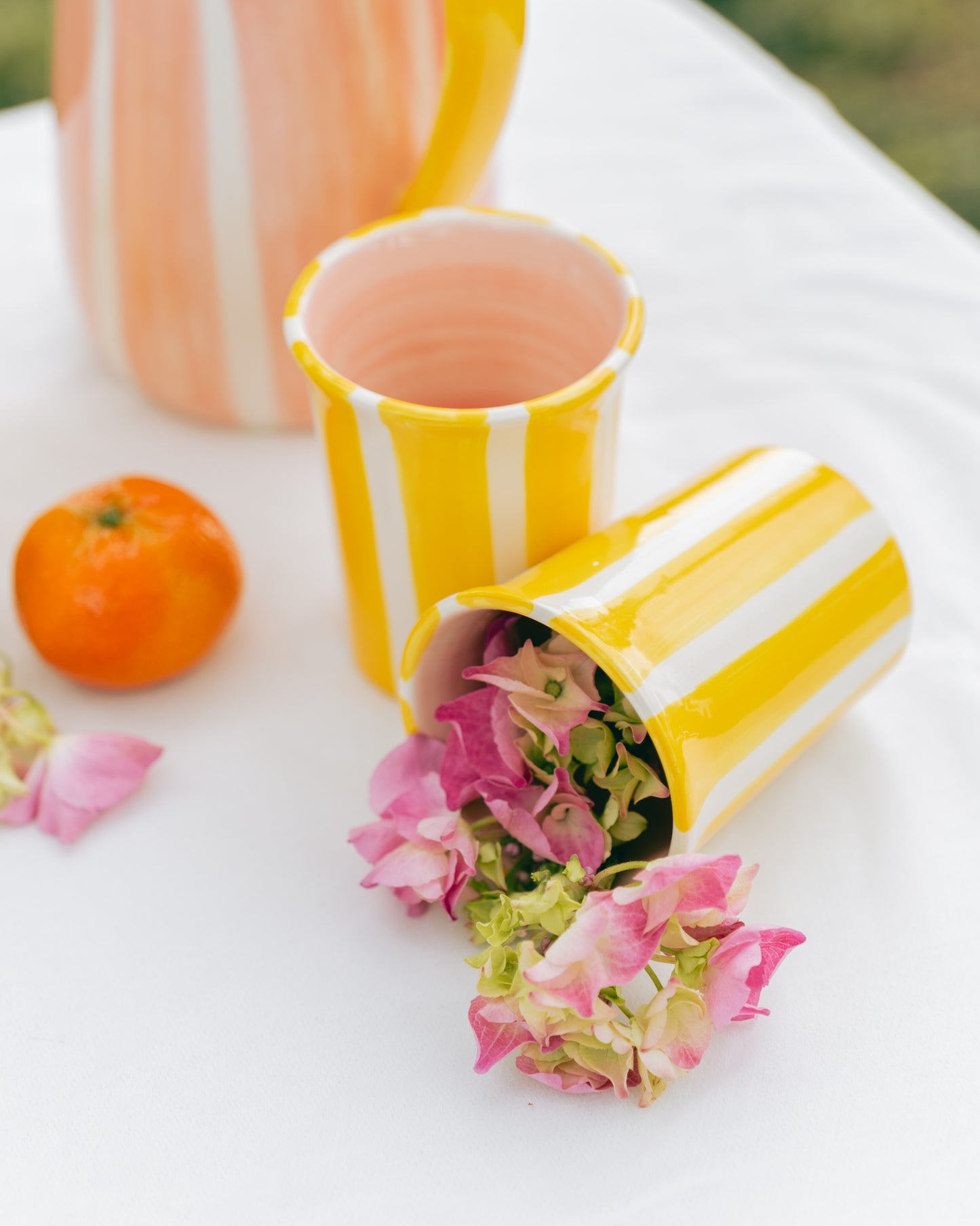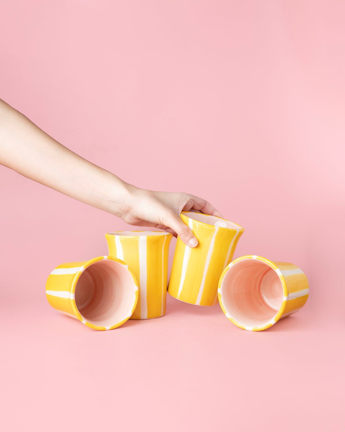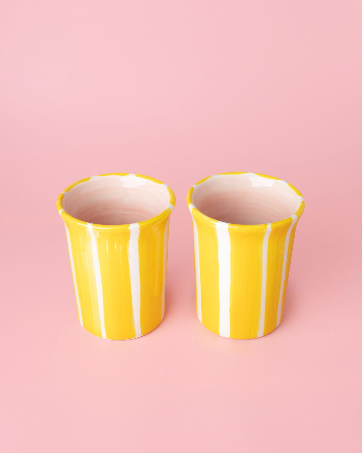 Llena tu mesa de color y alegría con este pack de vasos de cerámica artesanal en tonos amarillo y rosa pasteles de la colección Valentina. Son ideales para el día a día: desde un café por la mañana hasta una limonada fresca en una comida con amigas.