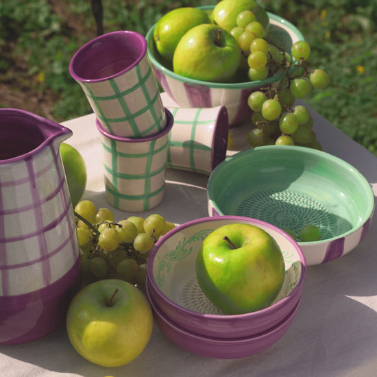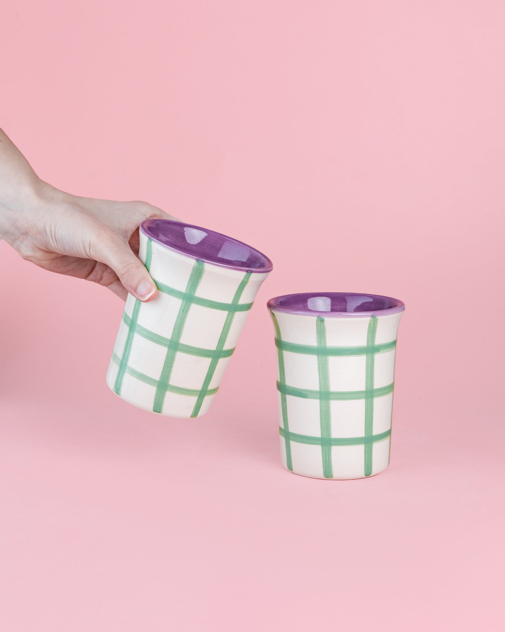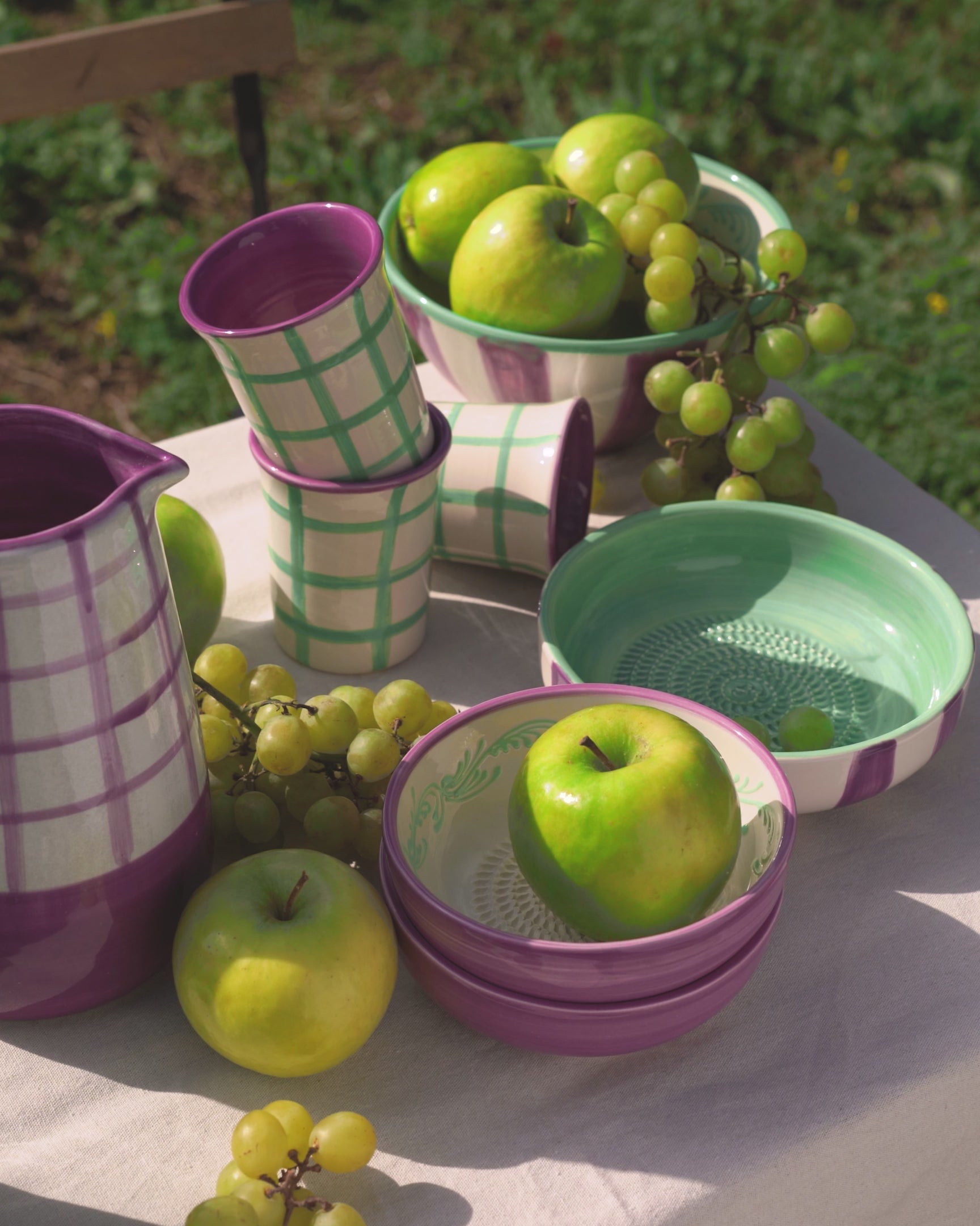 Con su combinación de pinceladas en verde y acabado en tono morado, cada vaso transmite una energía viva y espontánea, inspirada en la ligereza de la primavera y en la belleza de lo imperfecto. Son piezas que llaman la atención sin esfuerzo y que encajan tanto en el día a día como en ocasiones más especiales.
