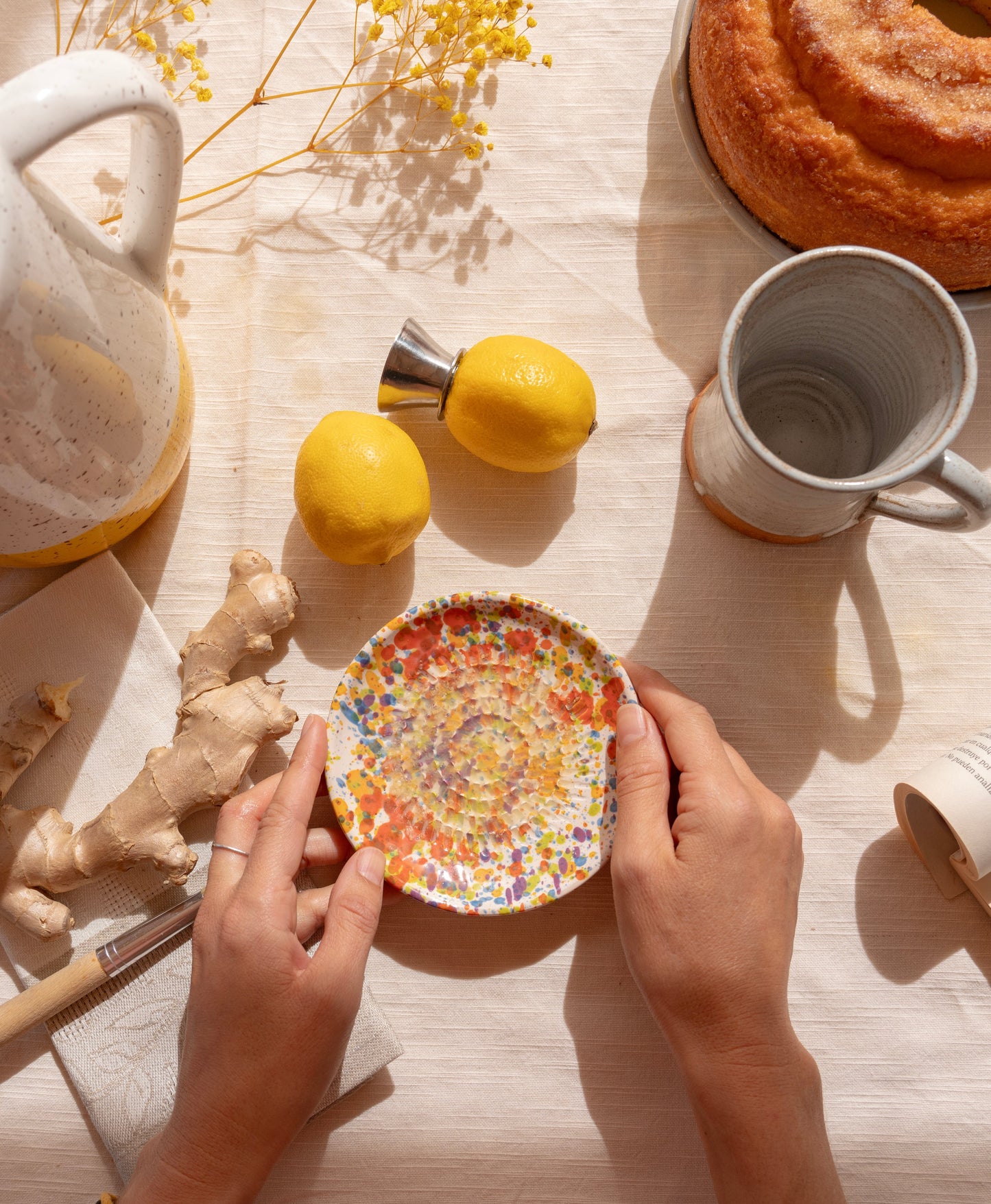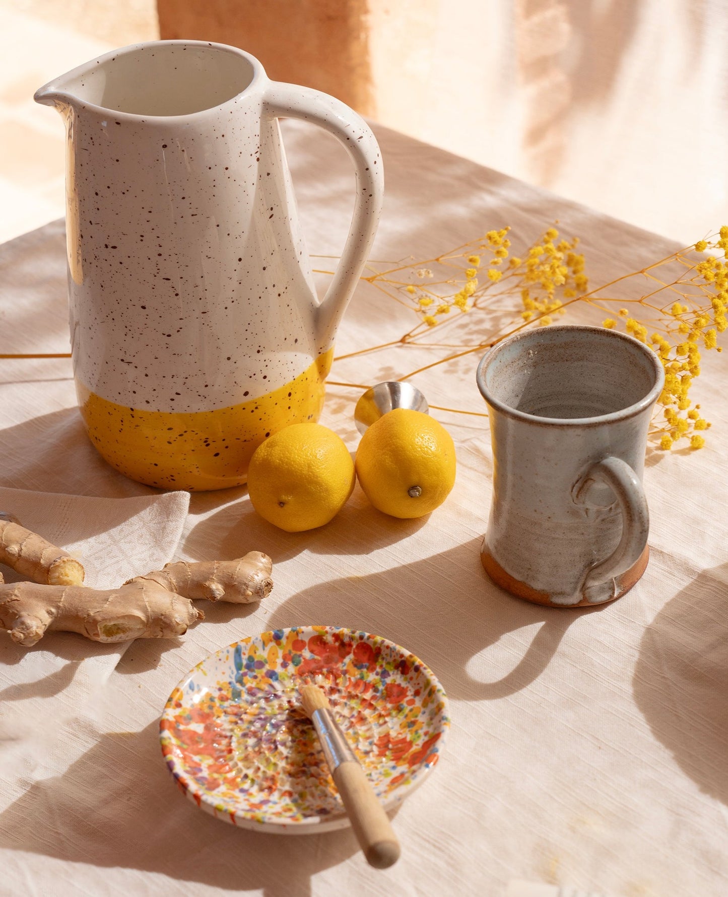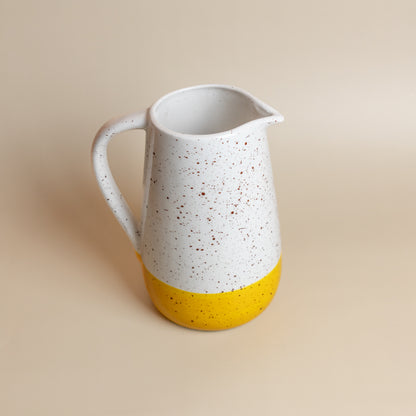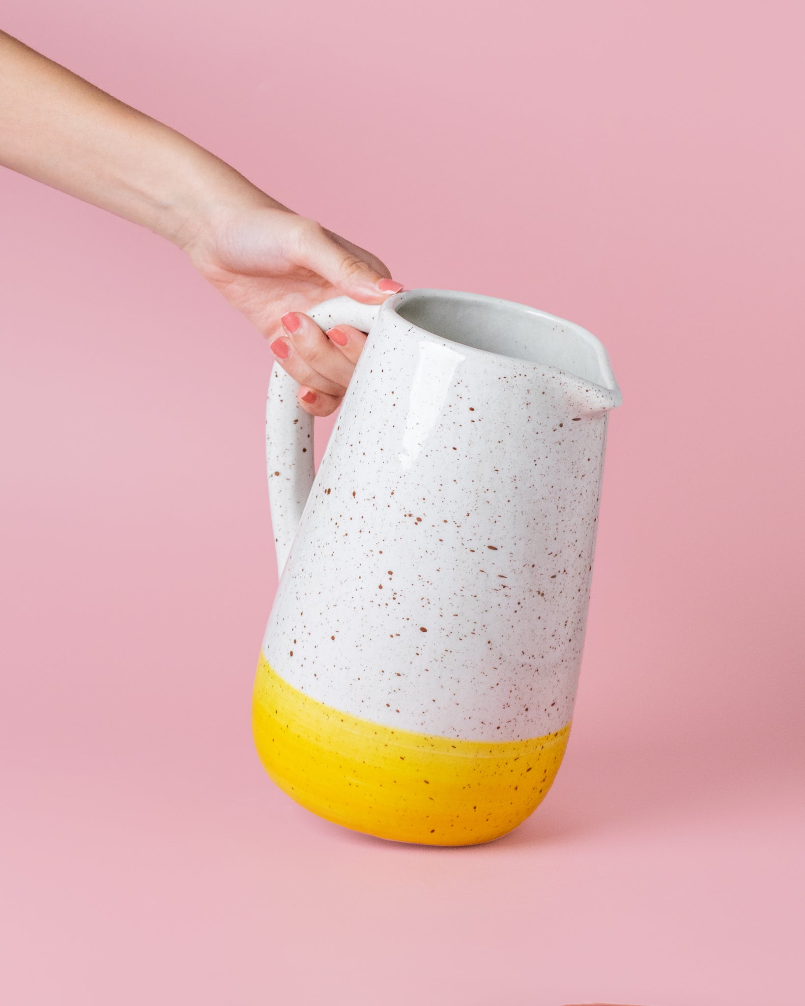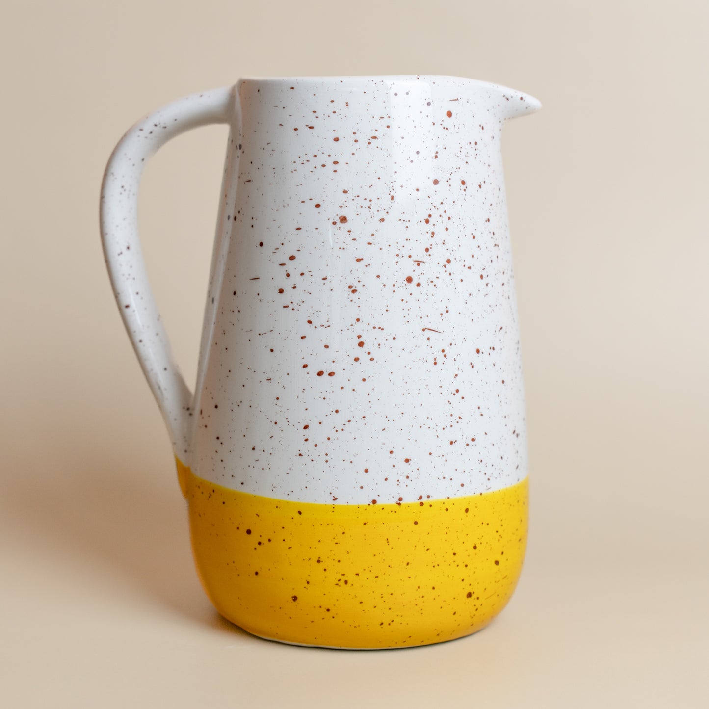 La ultima moda en tu mesa, dale un toque moderno a tu hogar con nuestra jarra de cerámica, perfecta servir a tus personas favoritas un rico té helado o para decorar de la manera más original usándolo de florero. Nuestra jarra Canela, con base amarilla y detalles en motas marrones puede ser el complemento ideal en tu mesa estás navidades.