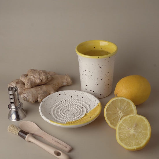 Nuestro Set de Infusión no es solo una delicia para los sentidos, también es un aliado para tu bienestar. El jengibre, conocido por sus propiedades antiinflamatorias y digestivas, se combina perfectamente con la vitamina C y los antioxidantes del limón, creando una bebida que refuerza tu sistema inmunológico y revitaliza tu cuerpo.Al utilizar nuestro set, extraes lo mejor de estos ingredientes naturales. El plato rallador de cerámica asegura que el jengibre libere todos sus aceites esenciales y compuestos beneficiosos, mientras que el exprimidor de limón te permite aprovechar cada gota de su jugo lleno de nutrientes.