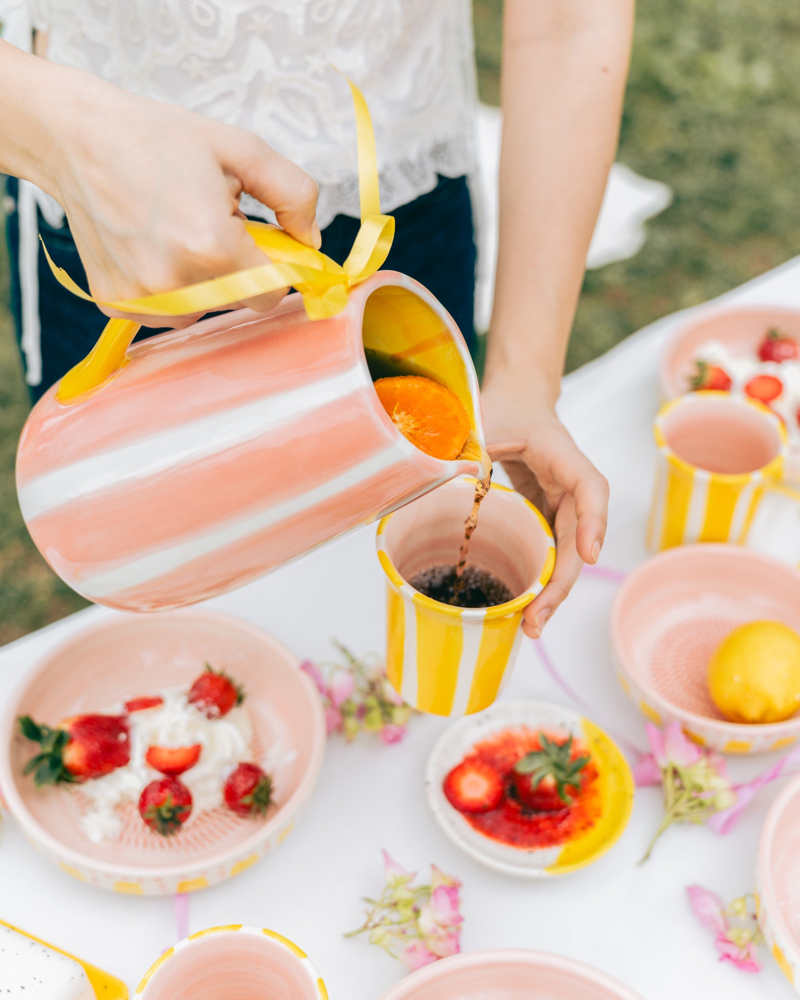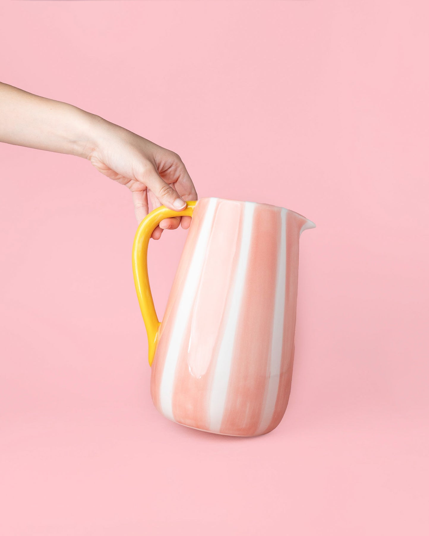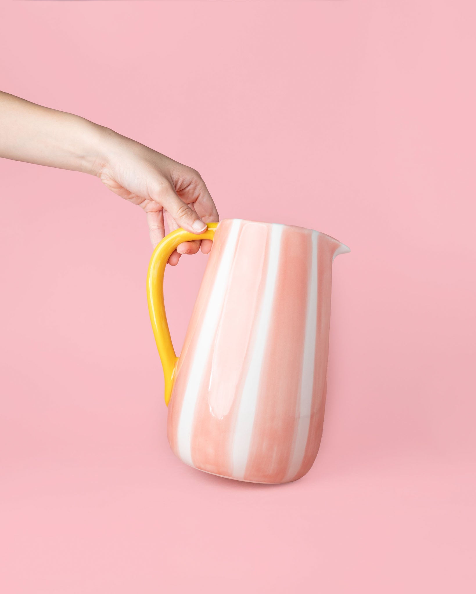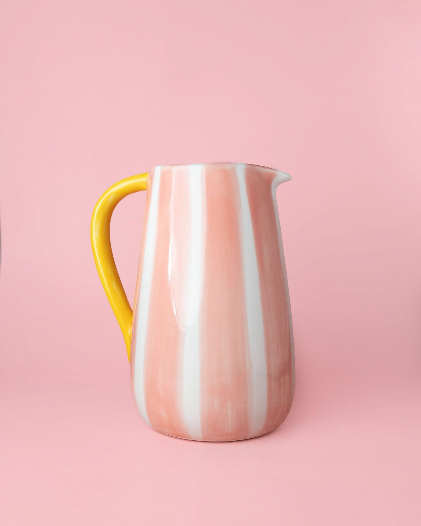 Lleva el color y la alegría a tu mesa con nuestra jarra de cerámica Valentina en tonos rosa y amarillo pastel. Un diseño suave y encantador que transforma cualquier rincón de tu hogar, ya sea para servir un refrescante té helado o como florero con mucho encanto.