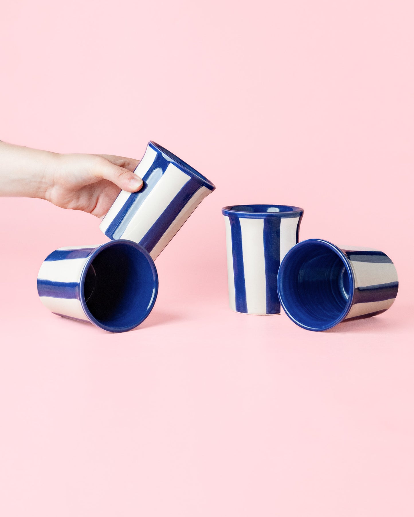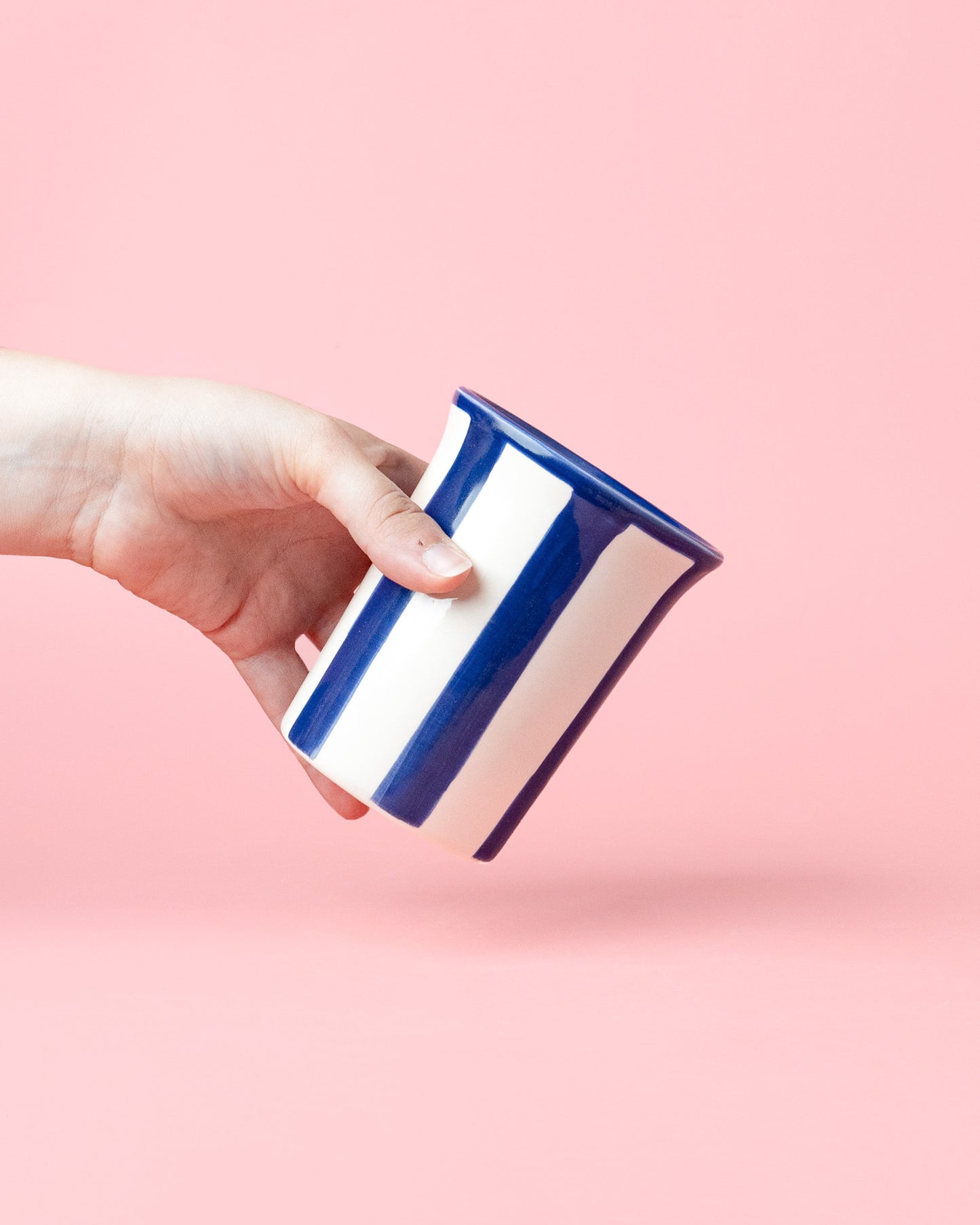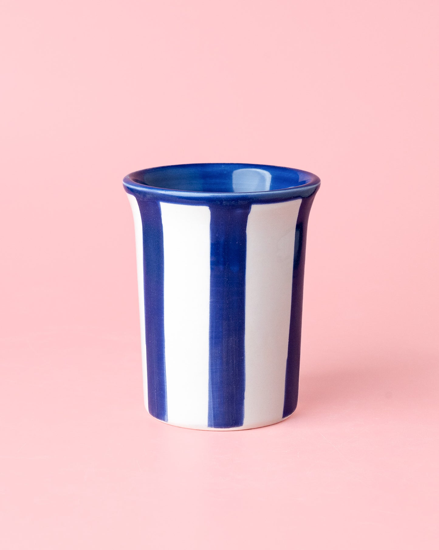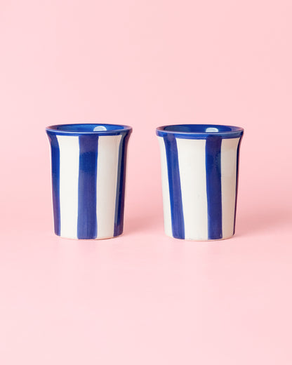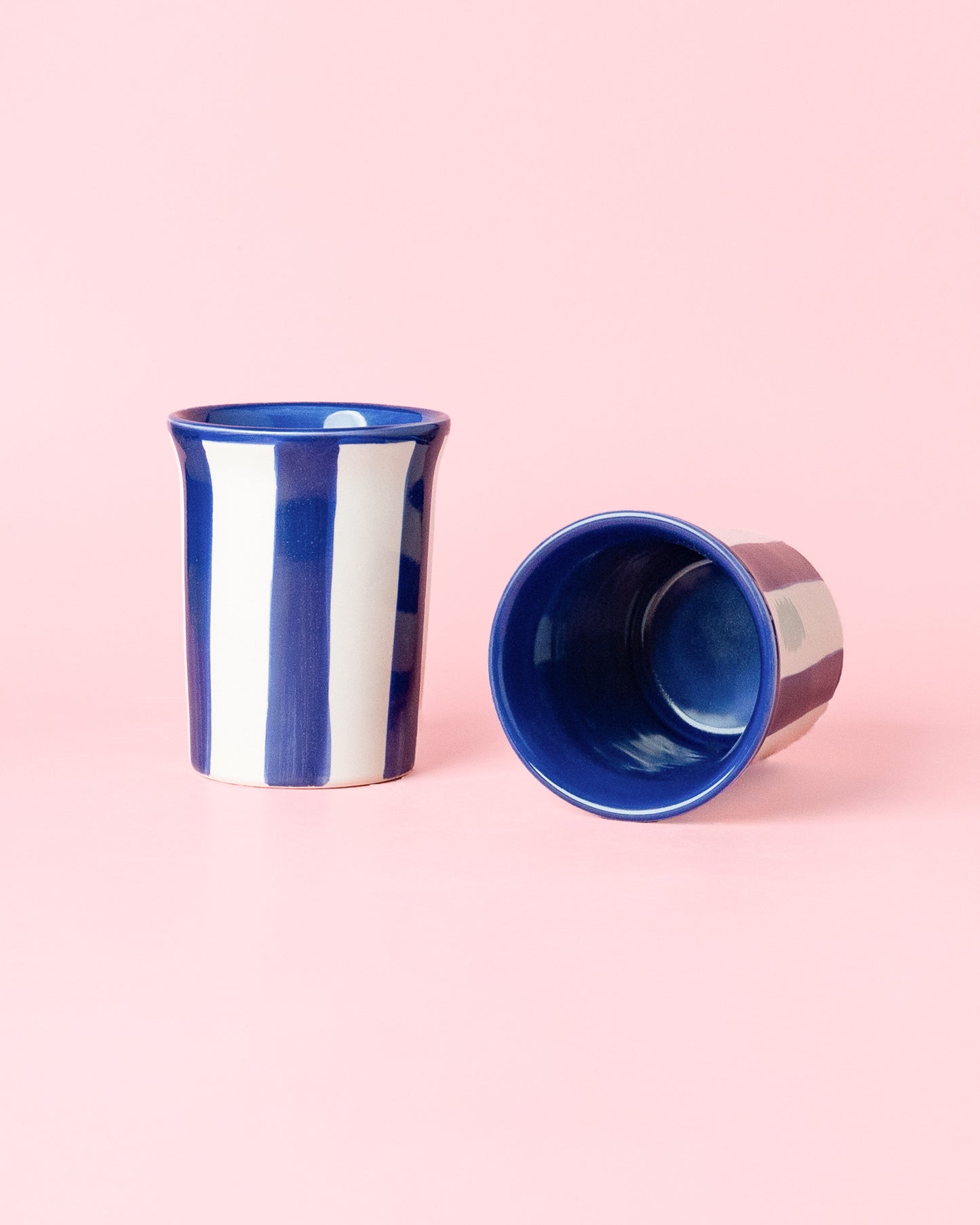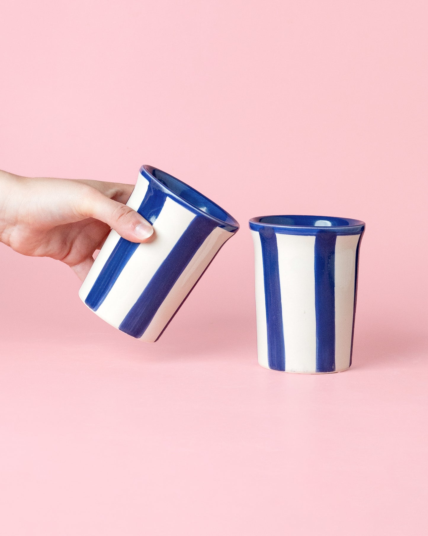Llena tu mesa de color y alegría con este pack de vasos de cerámica artesanal de la colección Costa Azul. Con sus rayas marineras azules sobre blanco, son ideales para el día a día: desde un café por la mañana hasta una limonada fresca en una comida con amigas.