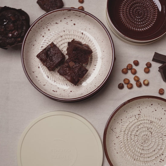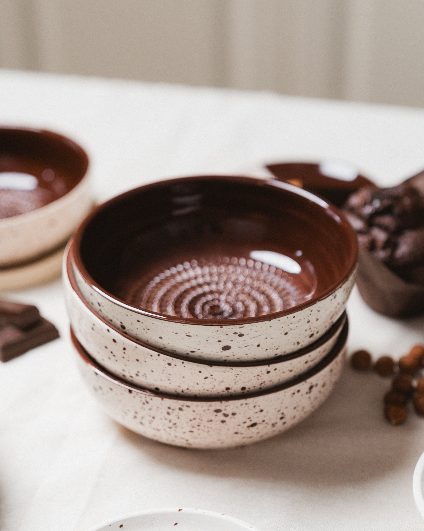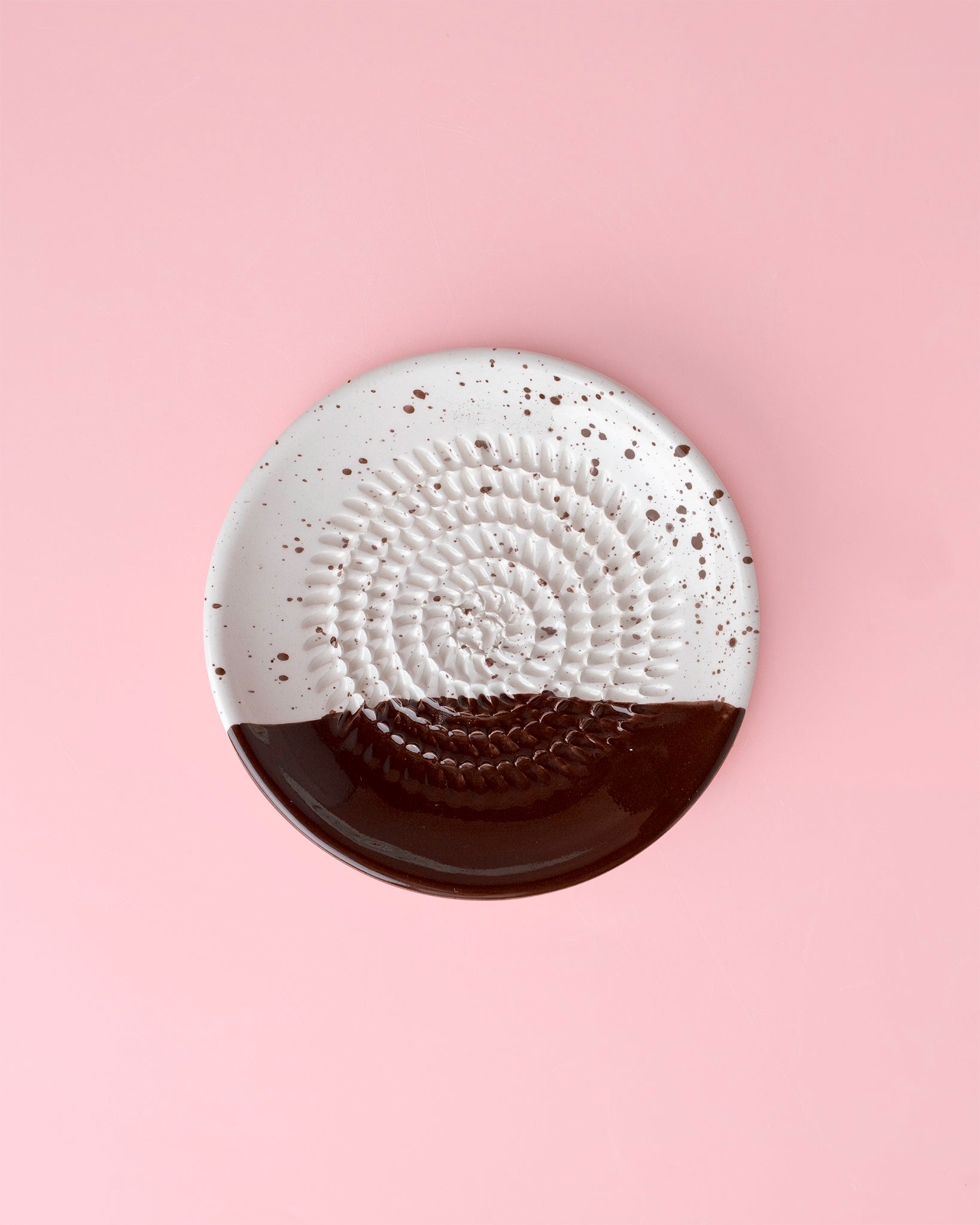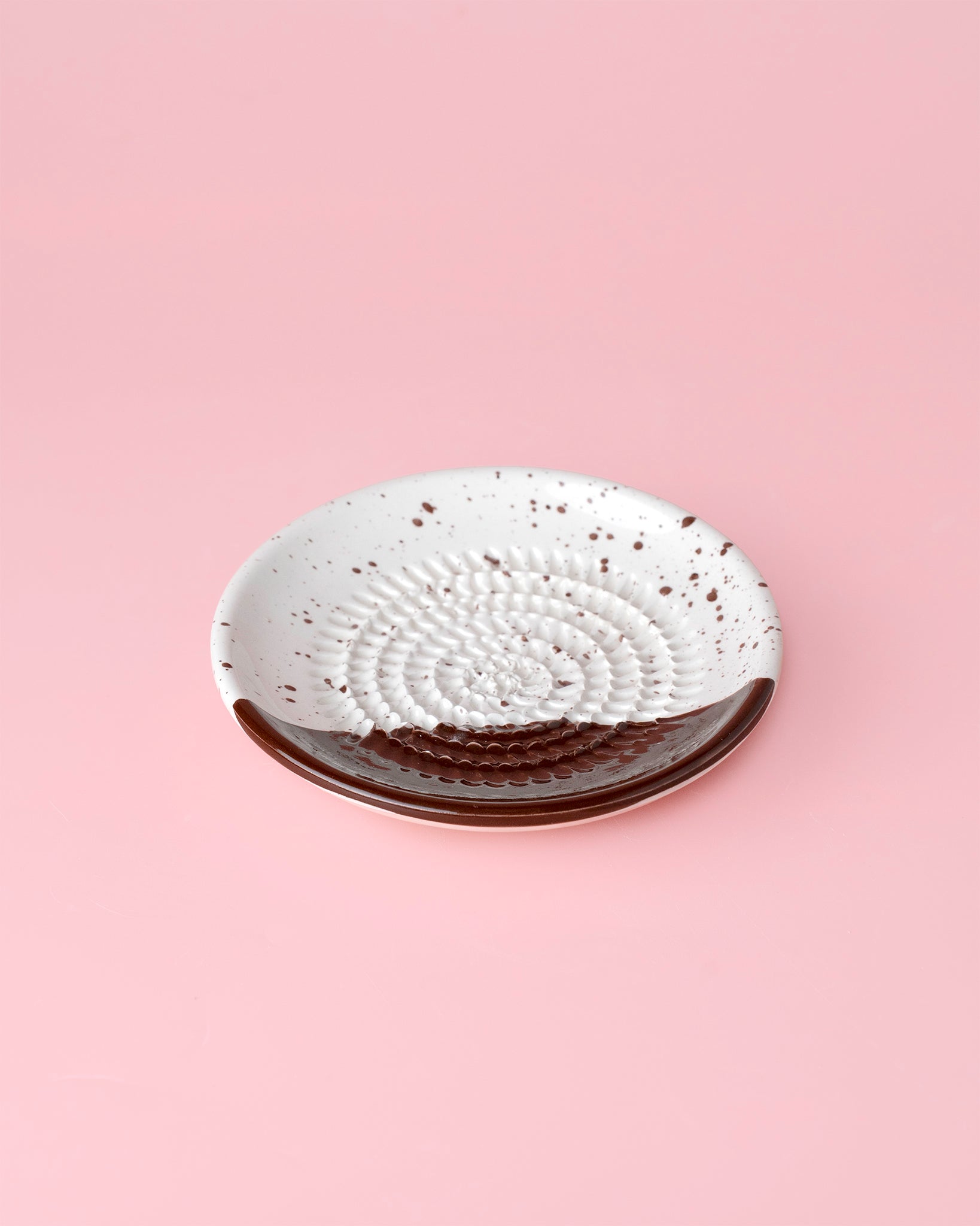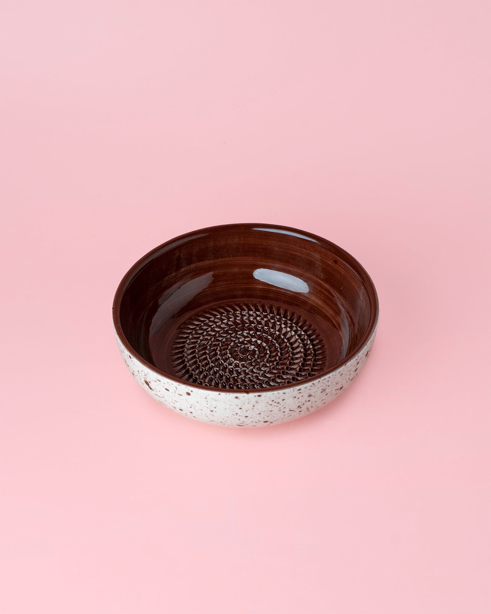 Con un esmalte profundo y brillante que parece bañado en chocolate, este plato rallador es pura tentación visual. Disponible en nuestros 3 tamaños.