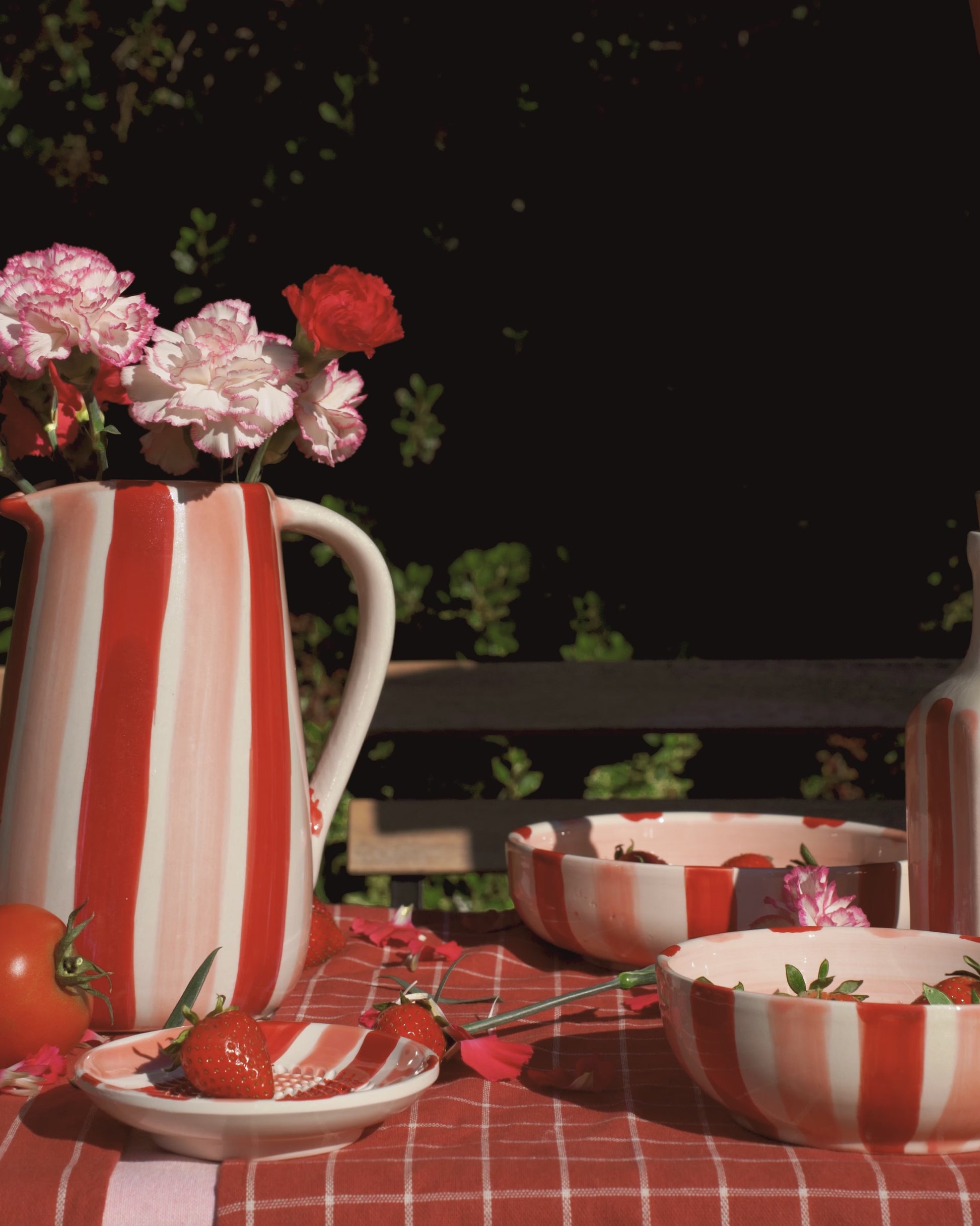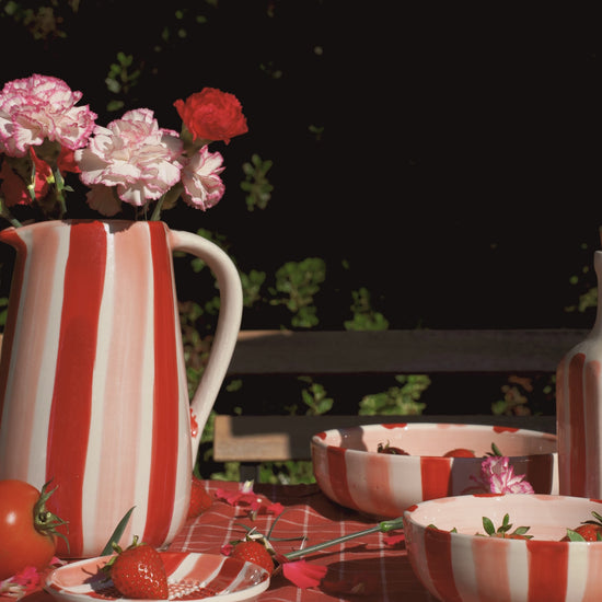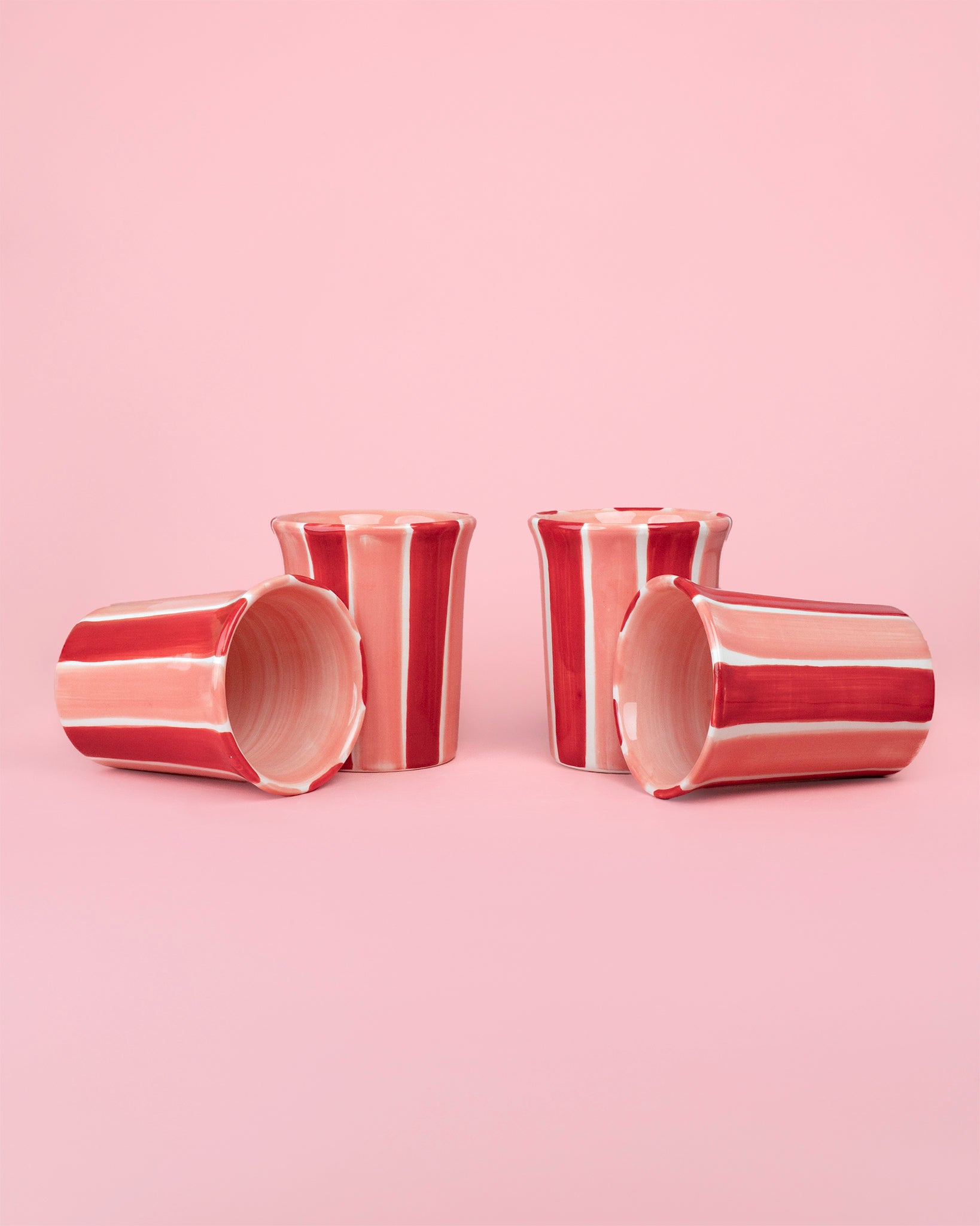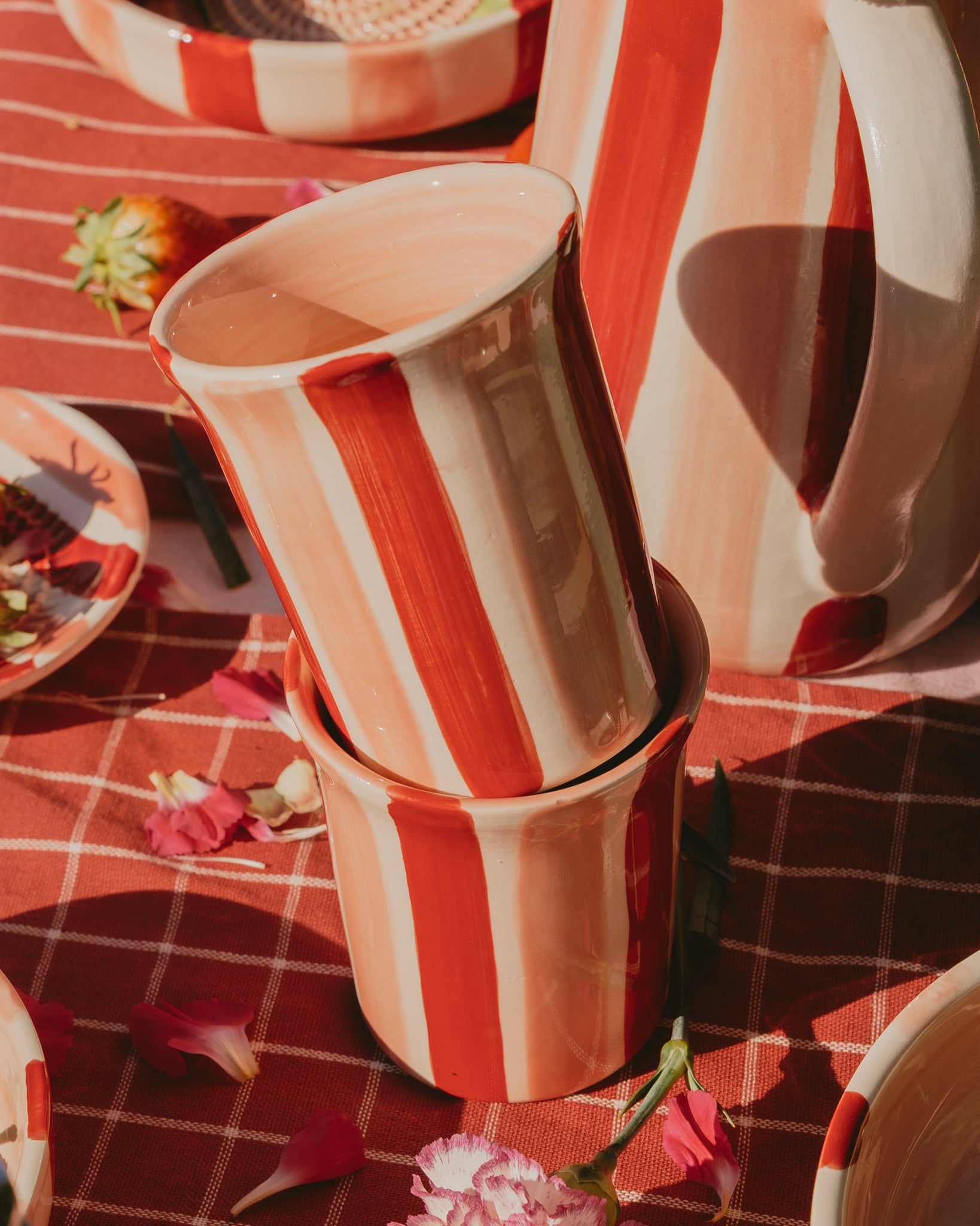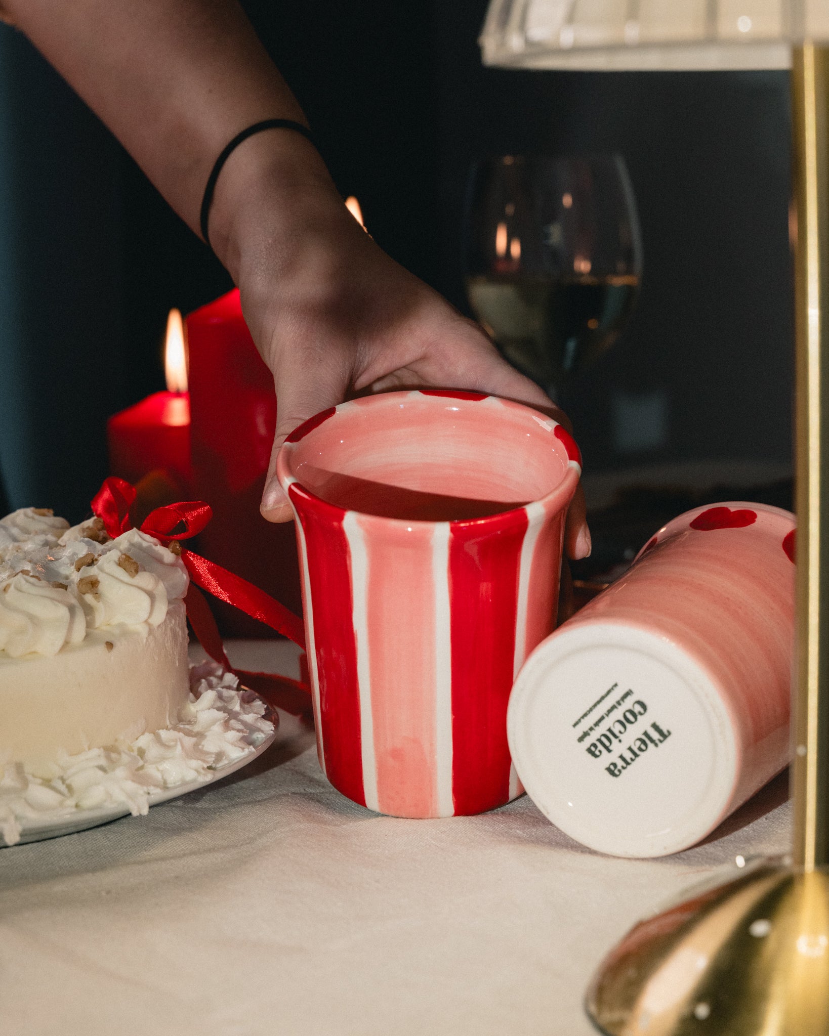 Ponle corazón a tus mañanas y rompe con la rutina. Nuestros vasos de cerámica artesanal son la dosis de alegría y color que tu mesa estaba pidiendo. Con una vibrante combinación de rayas en tonos rojos y rosas, cada pieza invita a celebrar el amor propio y los pequeños momentos.