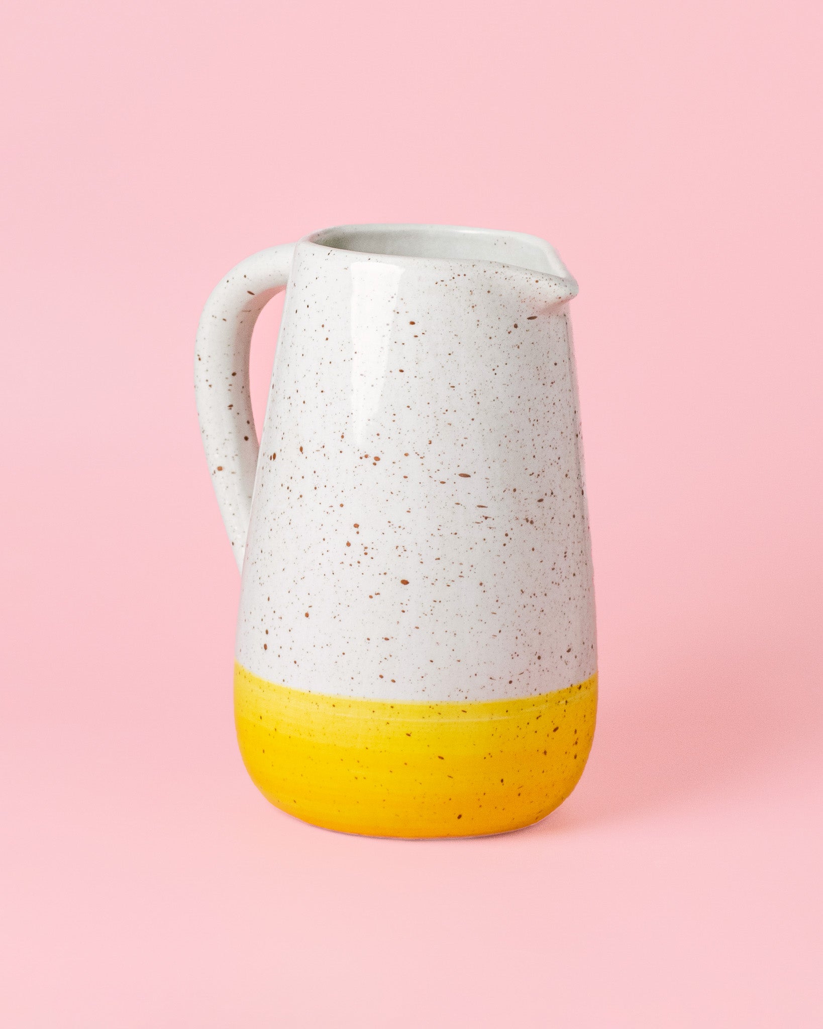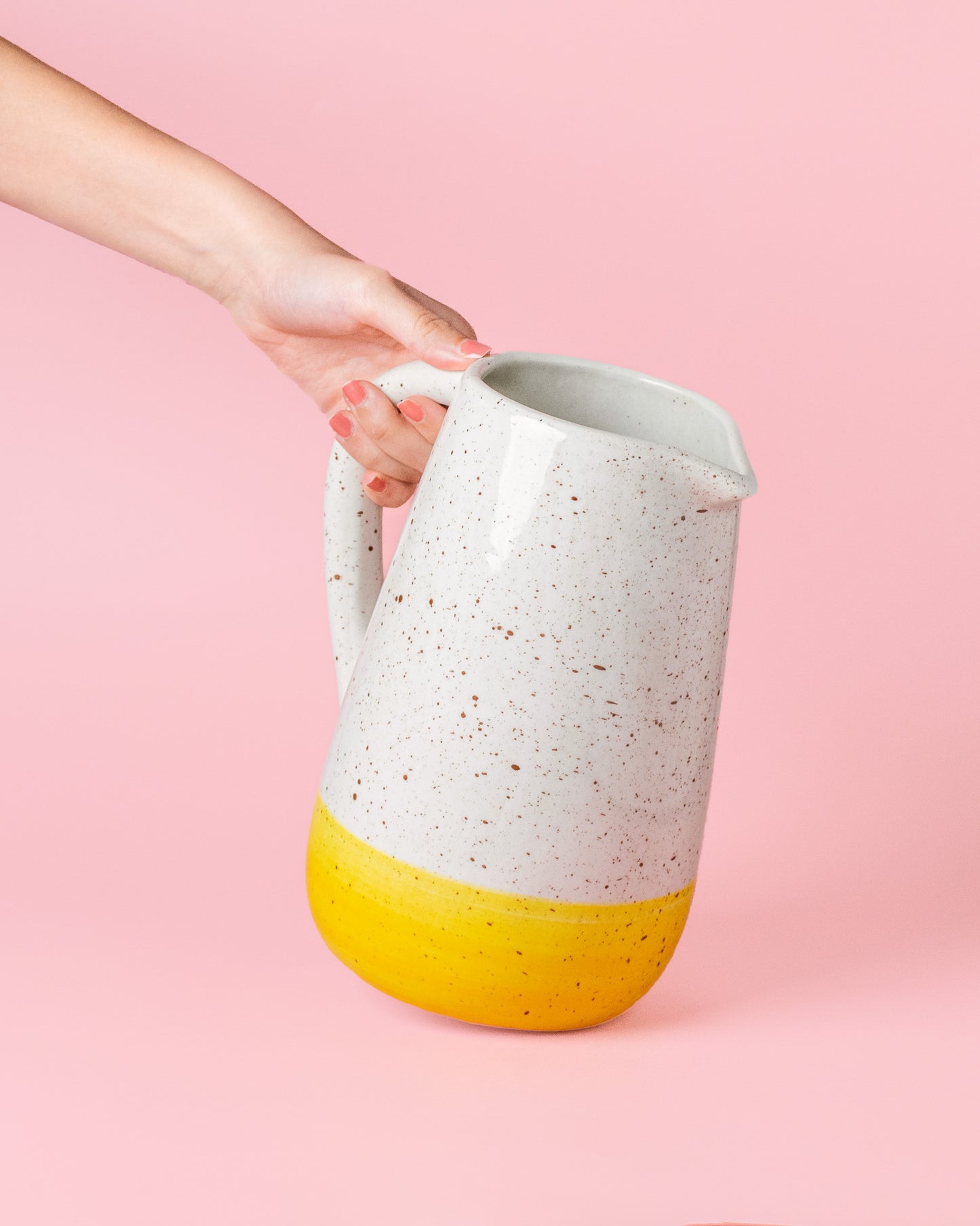 La ultima moda en tu mesa, dale un toque moderno a tu hogar con nuestra jarra de cerámica, perfecta servir a tus personas favoritas un rico té helado o para decorar de la manera más original usándolo de florero. Nuestra jarra Canela, con base amarilla y detalles en motas marrones puede ser el complemento ideal en tu mesa estás navidades.