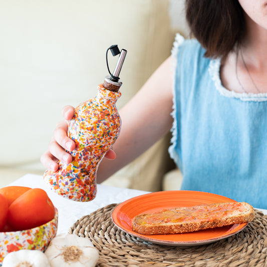Ideales para servir aceite de oliva sin goteo y aliñar ensaladas en la mesa. También puedes usarlas para vinagres, salsas o aderezos caseros. Su diseño artesanal protege el aceite de la luz y el aire, alargando su frescura, y además decoran tu cocina con un toque artesanal.