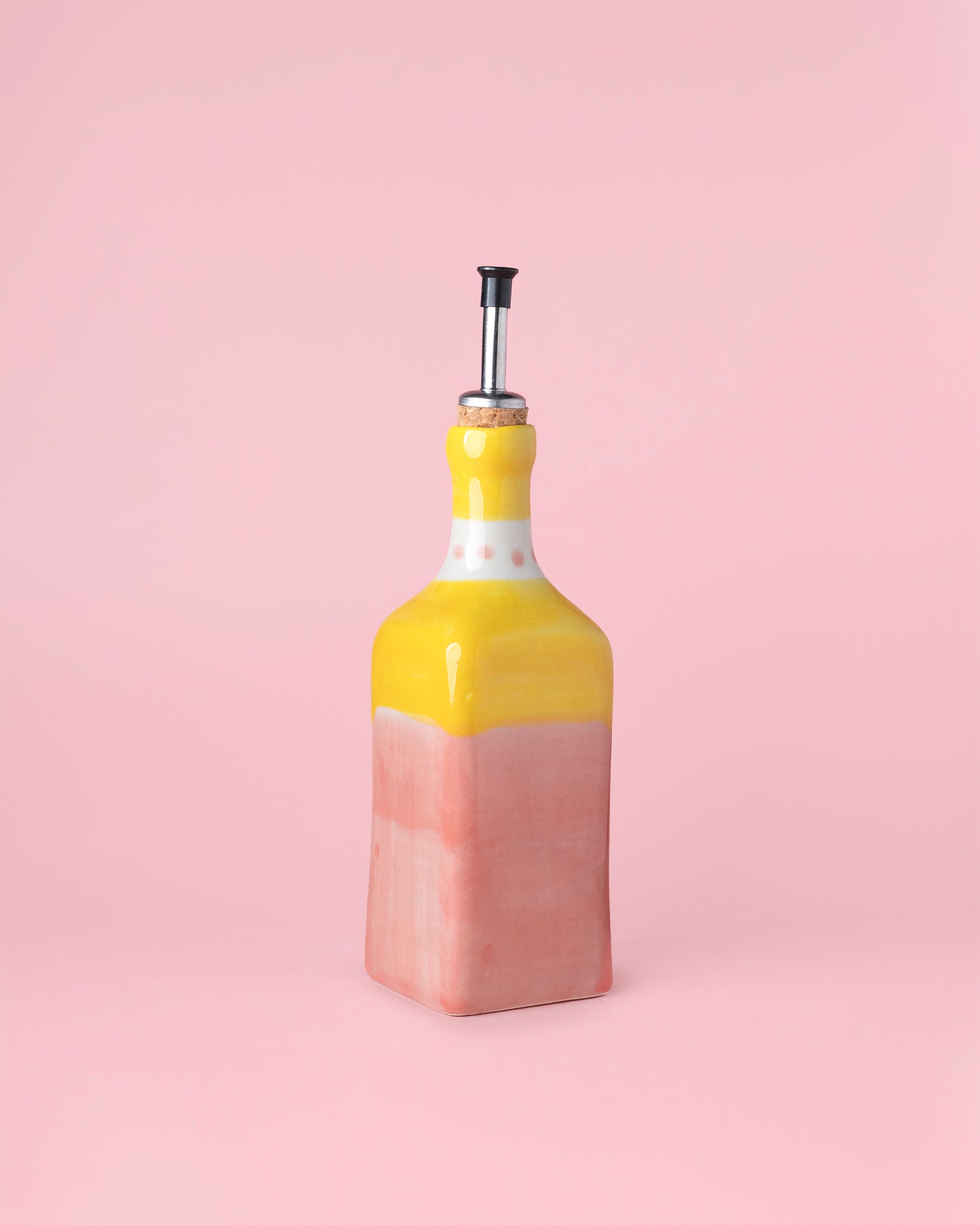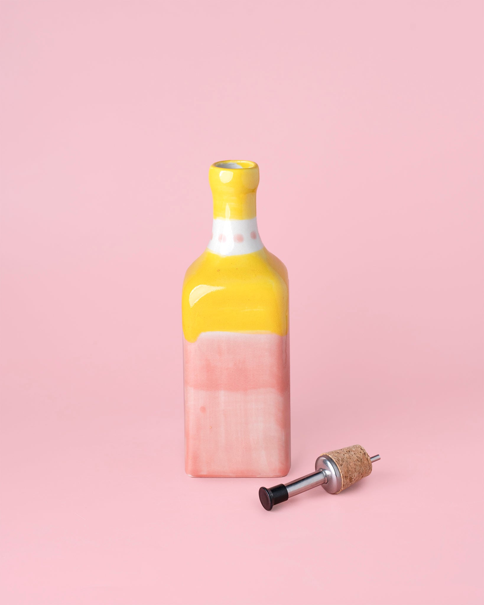 Con su acabado artesanal y su delicada combinación de tonos rosa y amarillo pastel, esta aceitera es ideal para servir aceite de oliva con estilo, precisión y un toque de encanto.