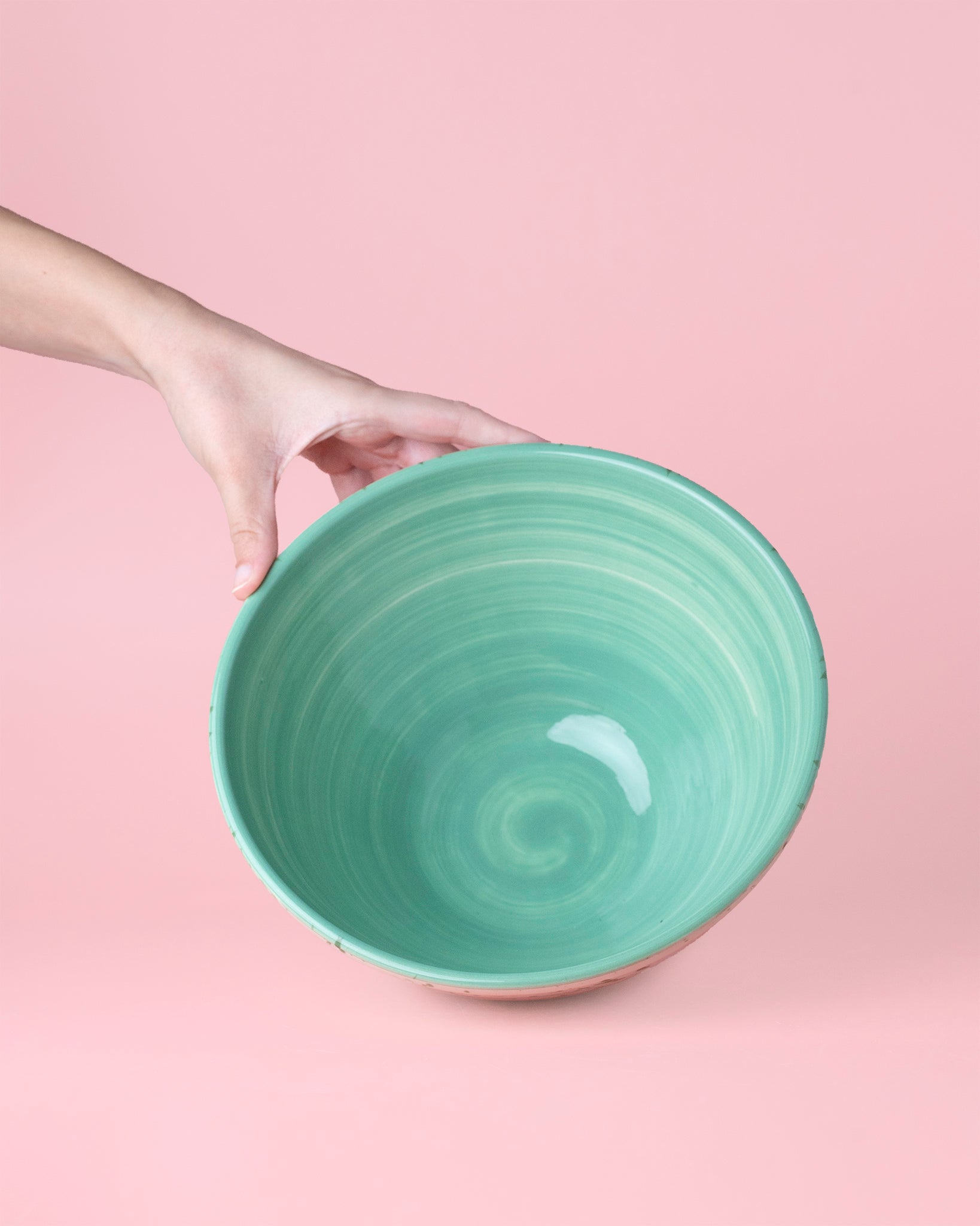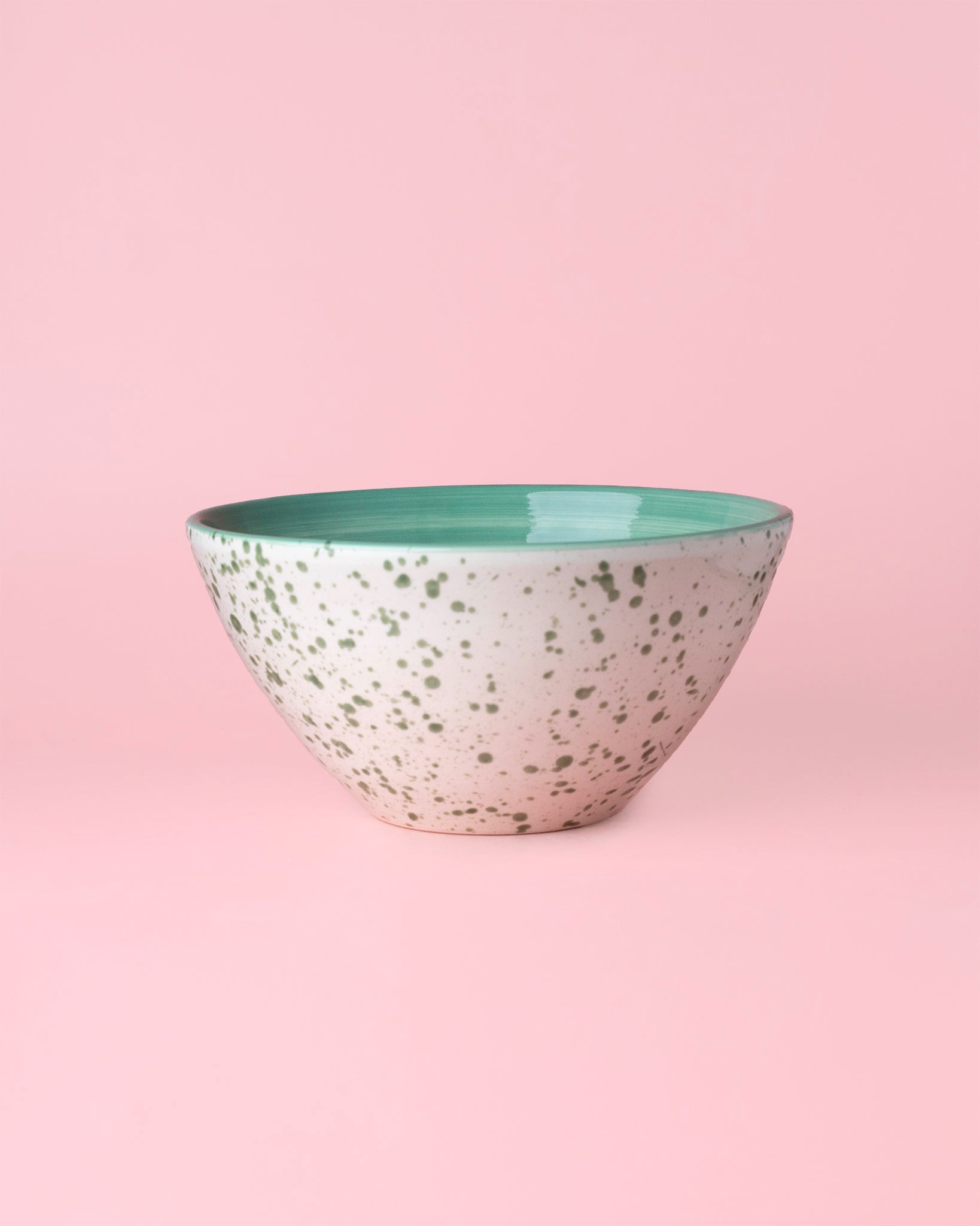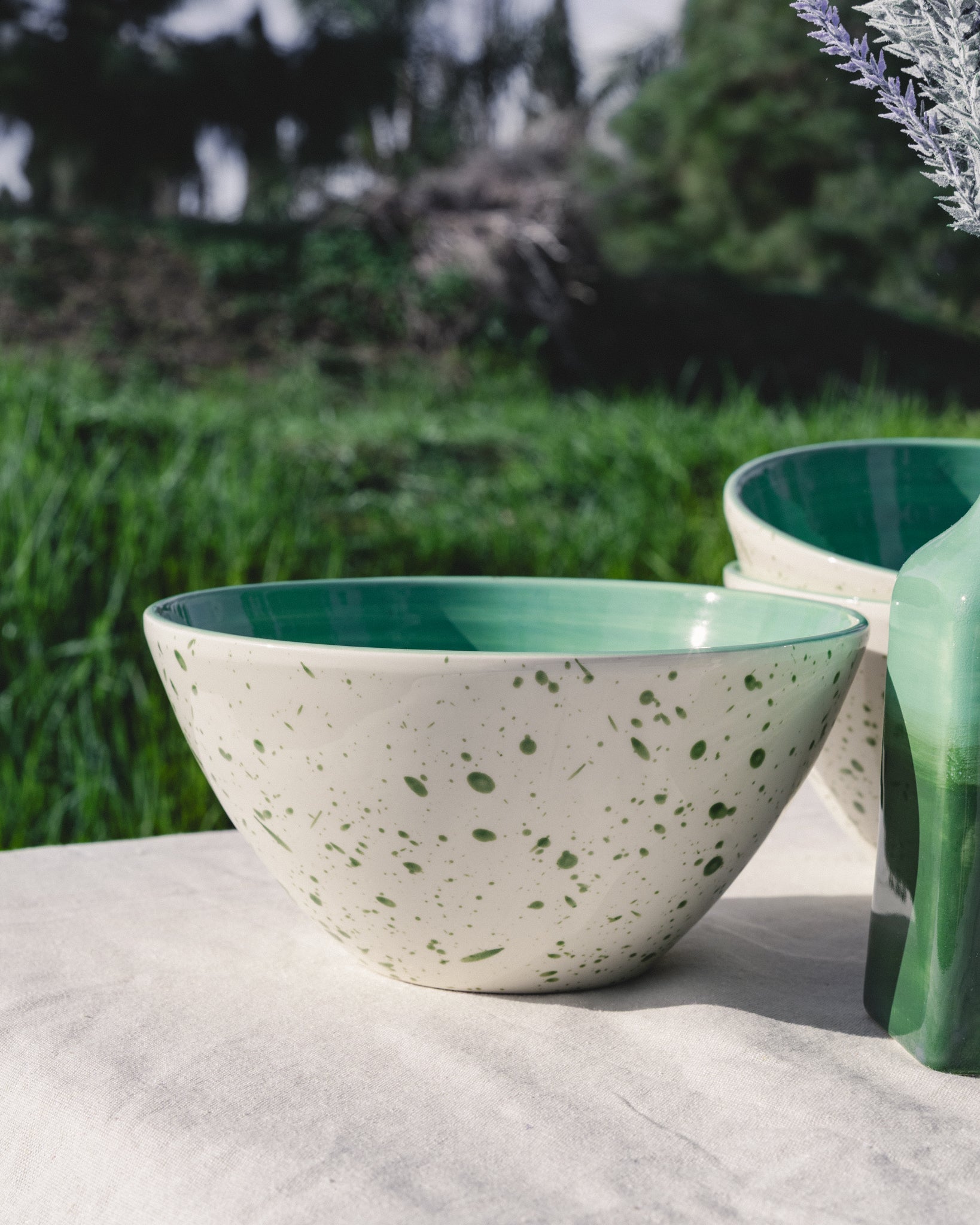 Hecha y pintada a mano en España, la ensaladera Jade destaca por su diseño en verde intenso con salpicaduras que le dan un estilo moderno y muy especial. Su acabado interior brillante y su exterior moteado la convierten en una pieza única que combina perfectamente lo artesanal con lo contemporáneo.