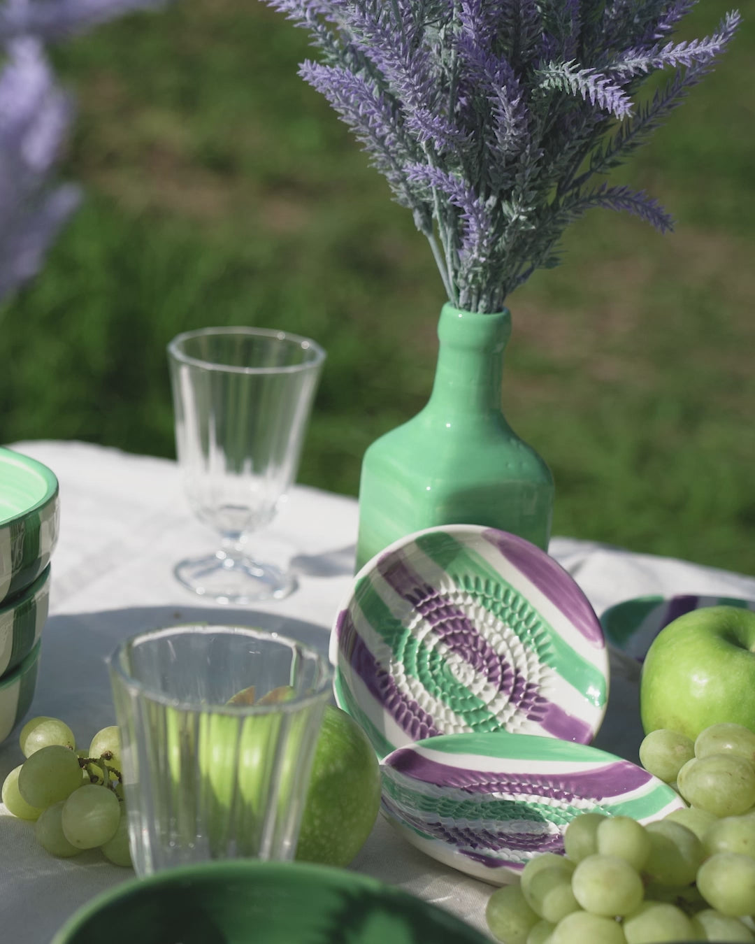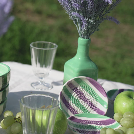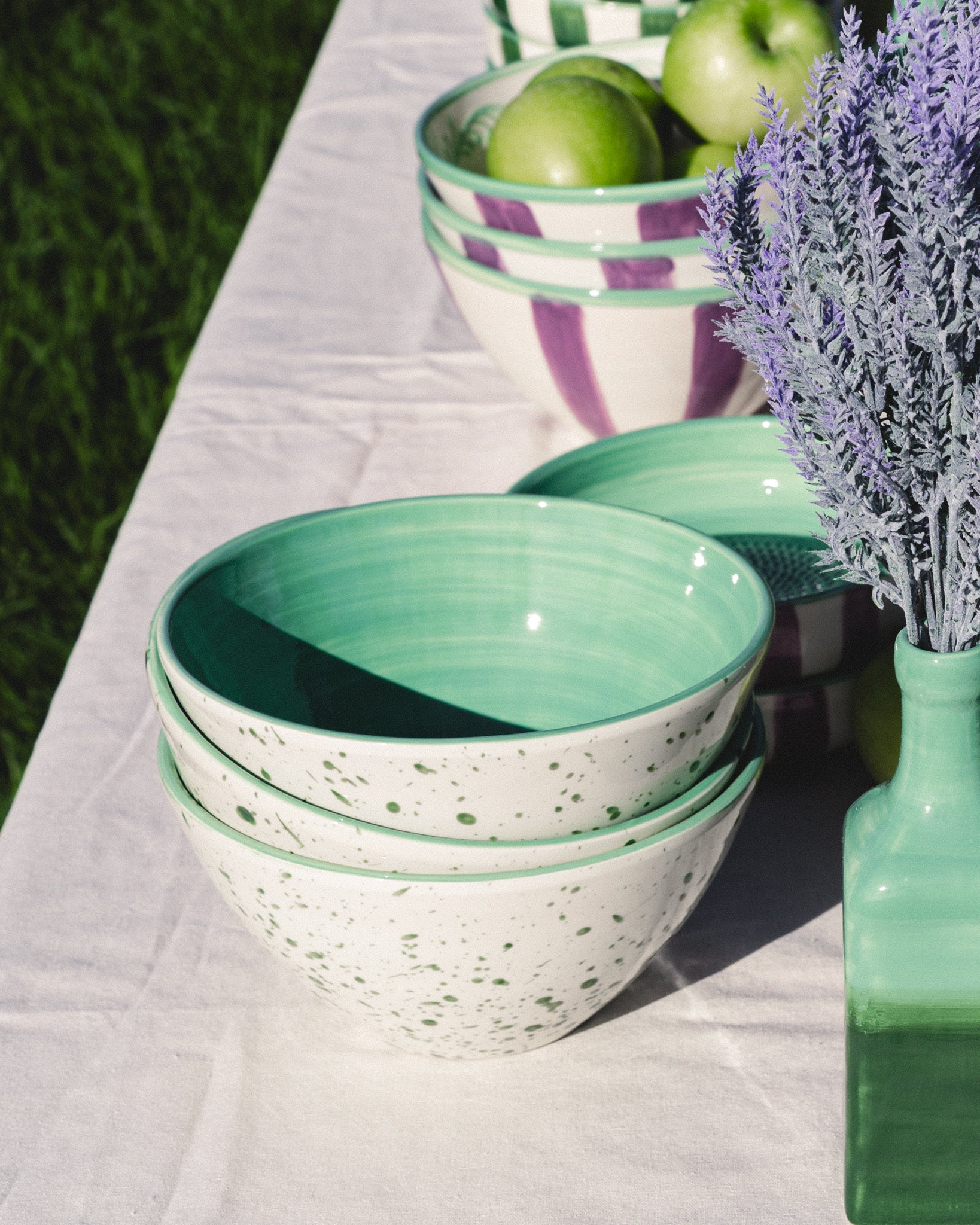 Hecha y pintada a mano en España, la ensaladera Jade destaca por su diseño en verde intenso con salpicaduras que le dan un estilo moderno y muy especial. Su acabado interior brillante y su exterior moteado la convierten en una pieza única que combina perfectamente lo artesanal con lo contemporáneo.