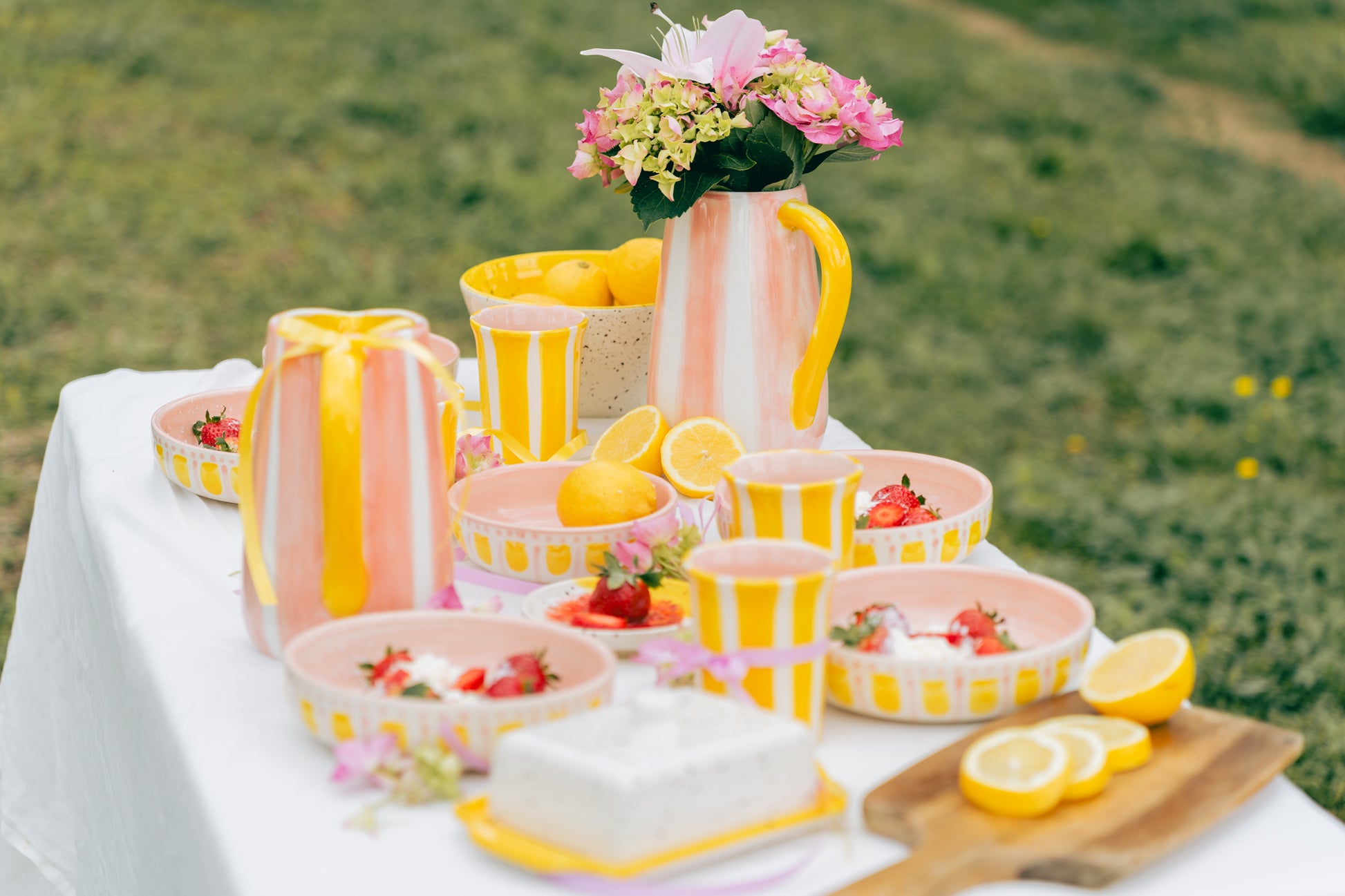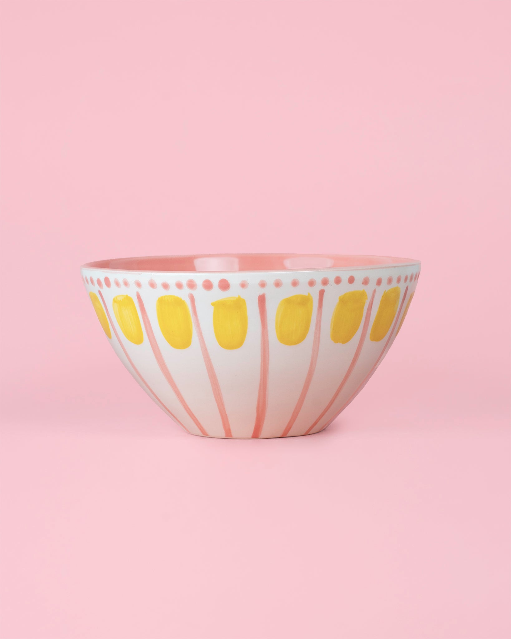 Hecha y pintada a mano en España, la ensaladera Valentina destaca por su diseño original en rosa y amarillo que le dan un estilo vintage y muy especial. Su acabado interior brillante en rosa la convierten en una pieza única que combina perfectamente lo artesanal con lo contemporáneo.