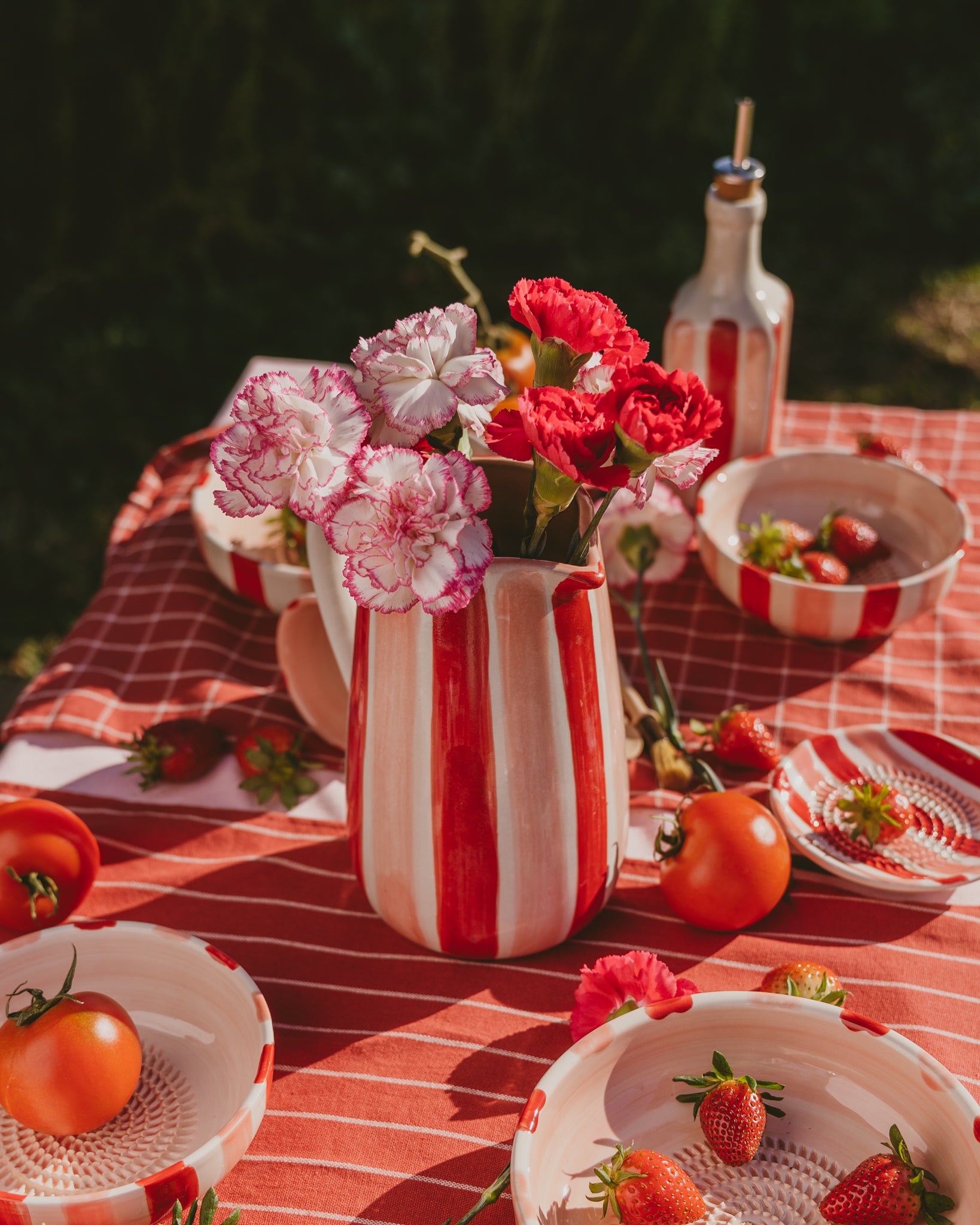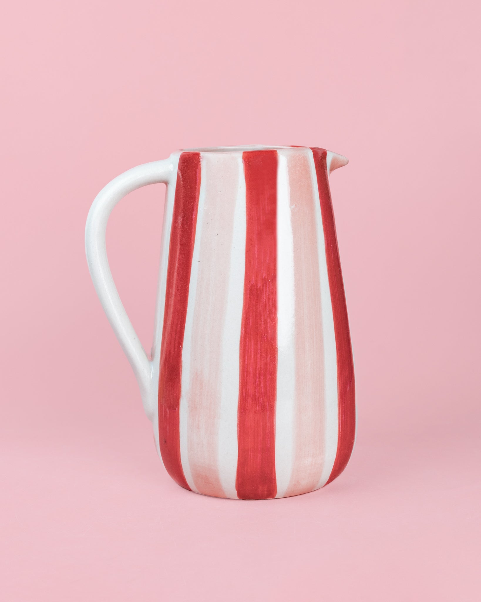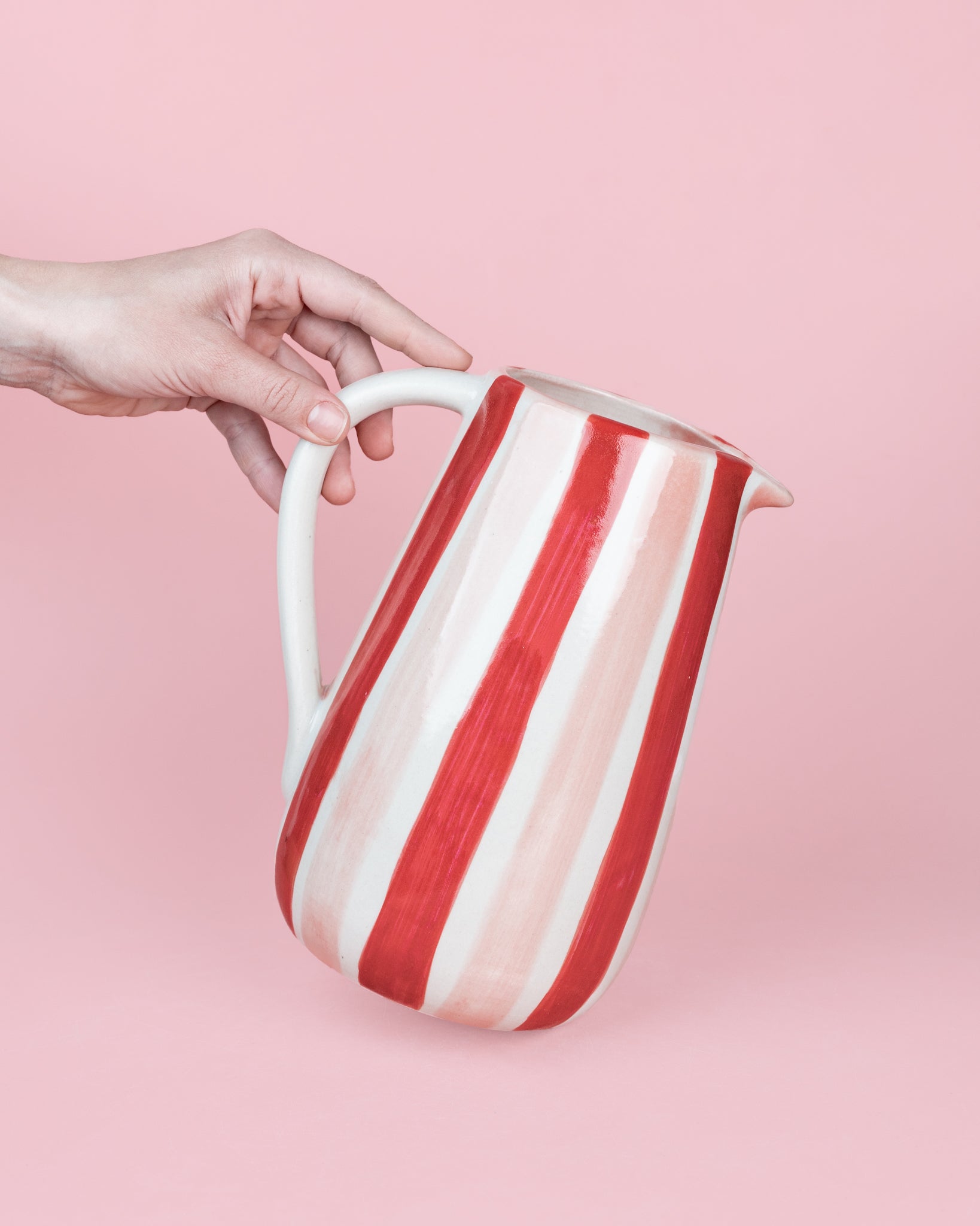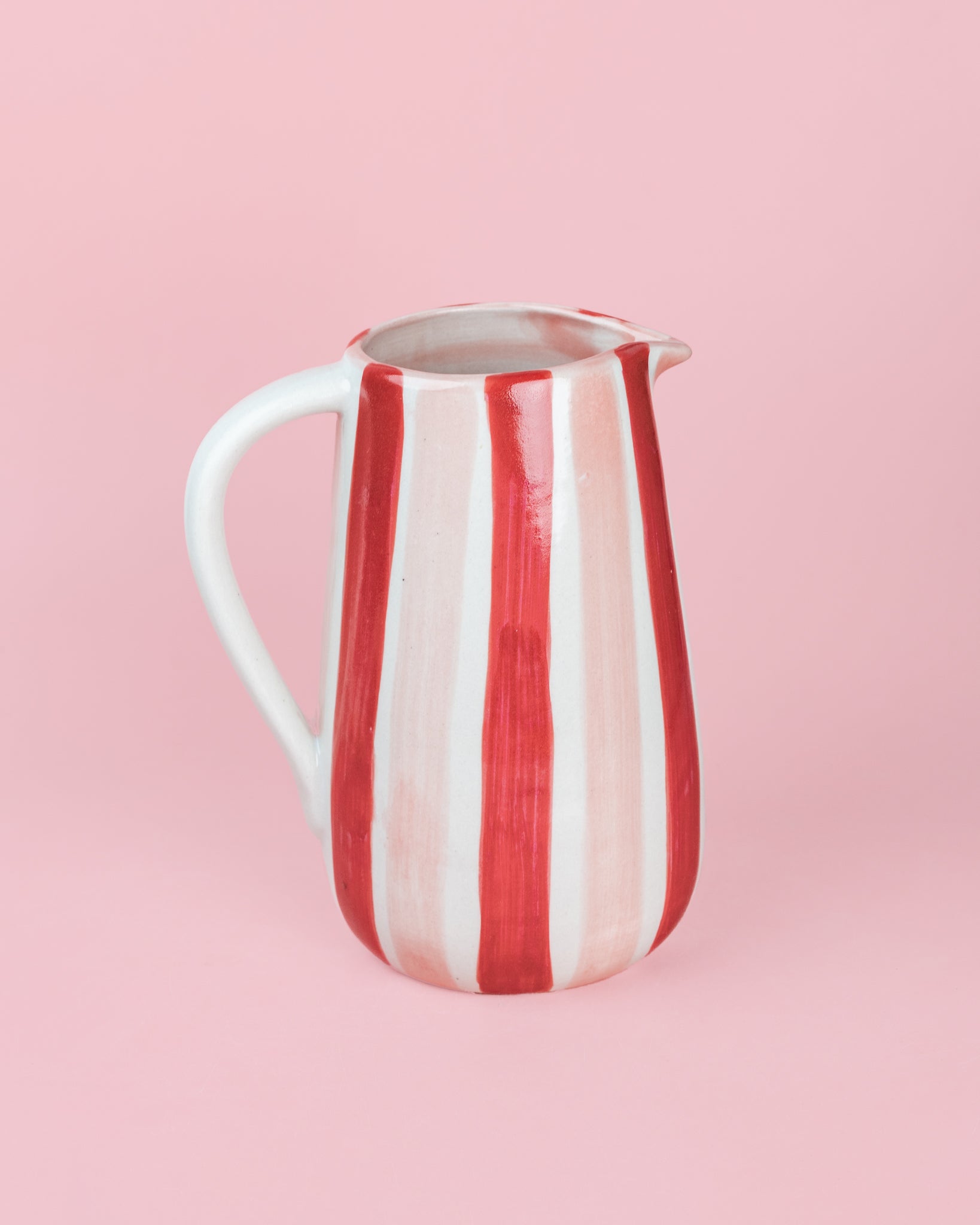 La Jarra Sweetheart está pintada a mano con rayas rojas y rosas, que le aportan ese punto atrevido y divertido a tu mesa. Llénala de agua con limón, de sangría, de lo que quieras. La cerámica, además, mantiene la temperatura de las bebidas por más tiempo, lo que la hace ideal para todo tipo de bebidas.