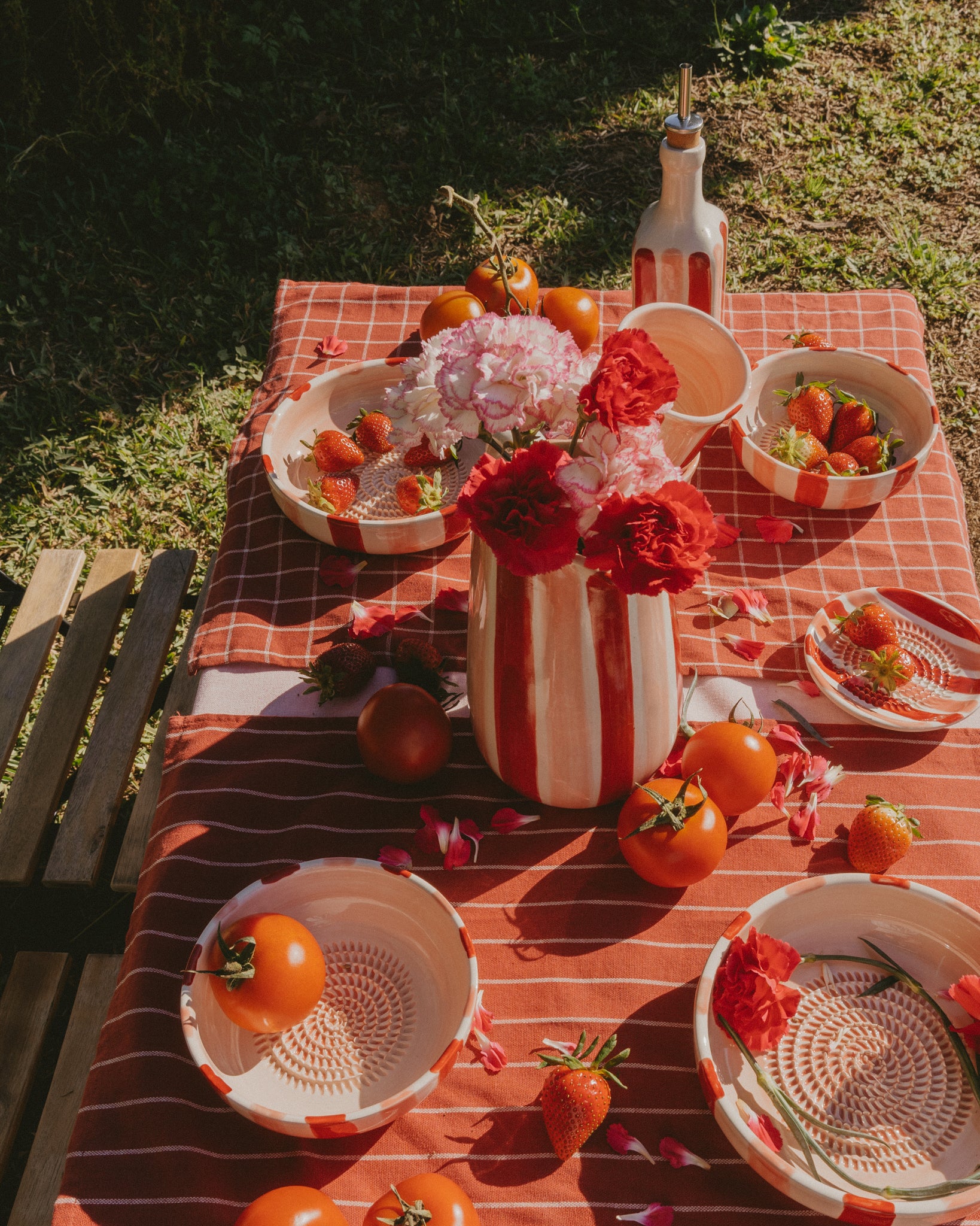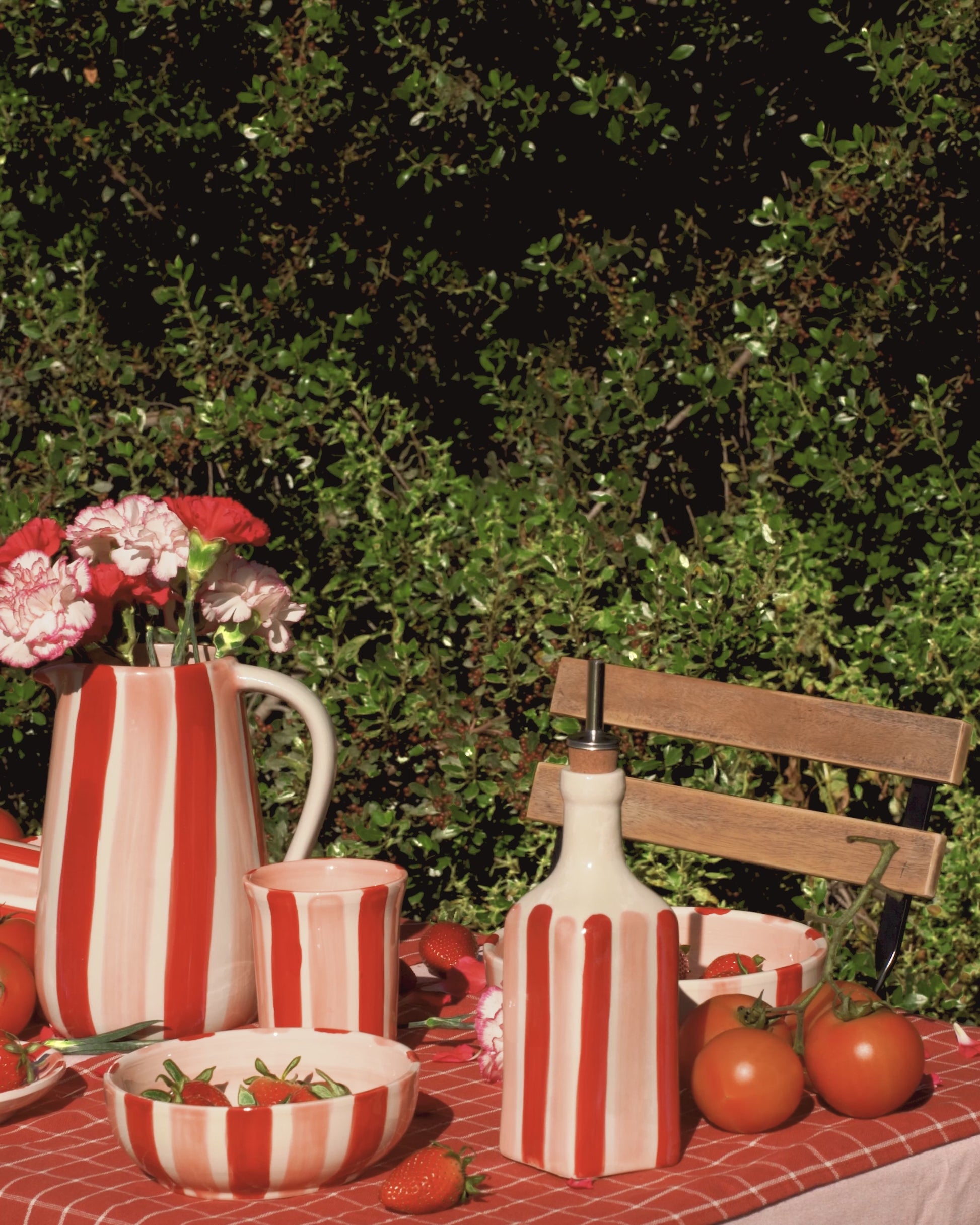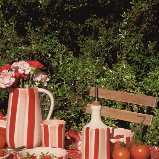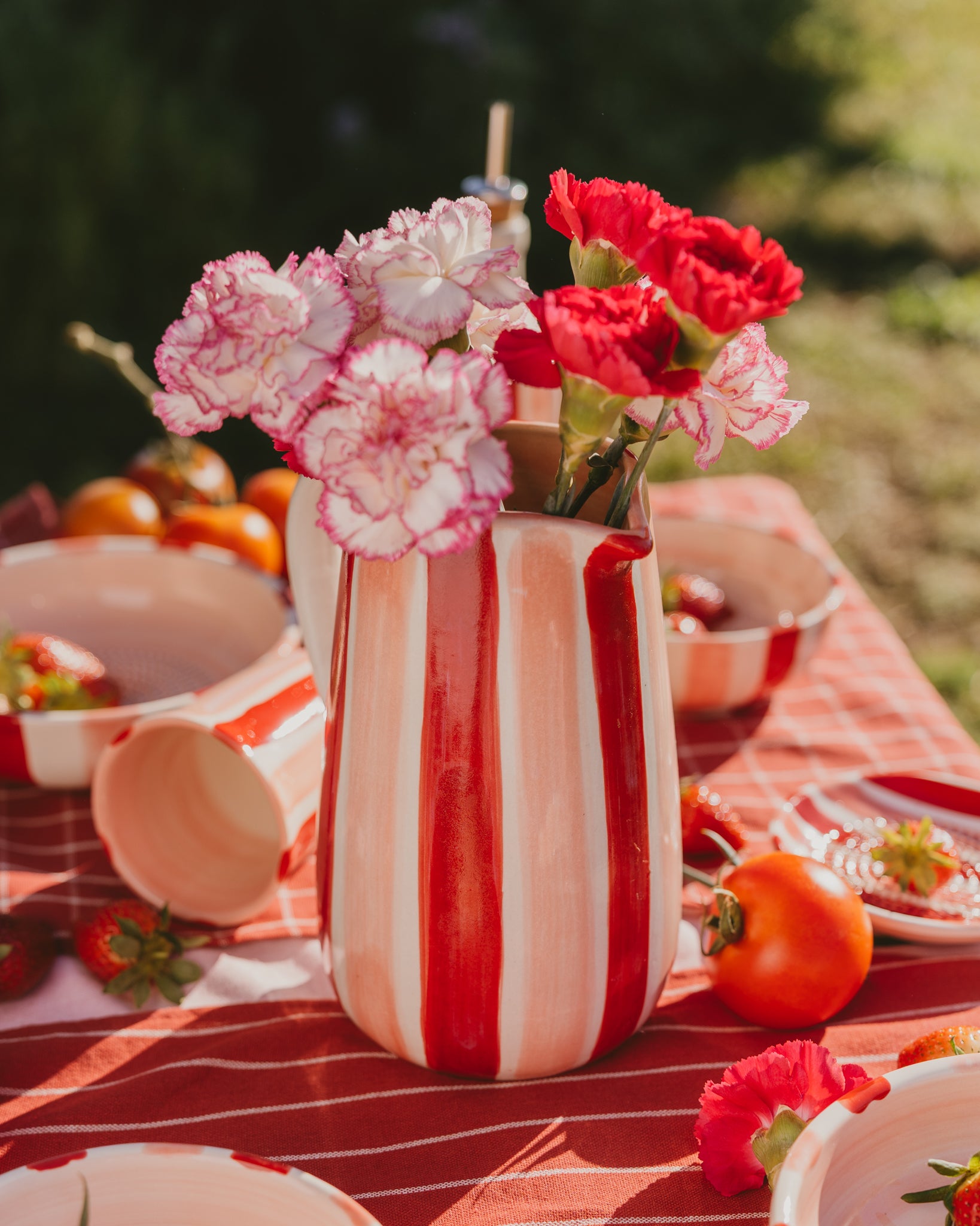 La Jarra Sweetheart está pintada a mano con rayas rojas y rosas, que le aportan ese punto atrevido y divertido a tu mesa. Llénala de agua con limón, de sangría, de lo que quieras. La cerámica, además, mantiene la temperatura de las bebidas por más tiempo, lo que la hace ideal para todo tipo de bebidas.