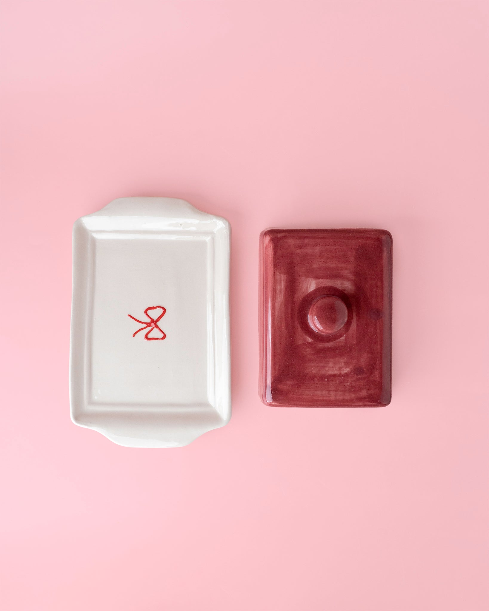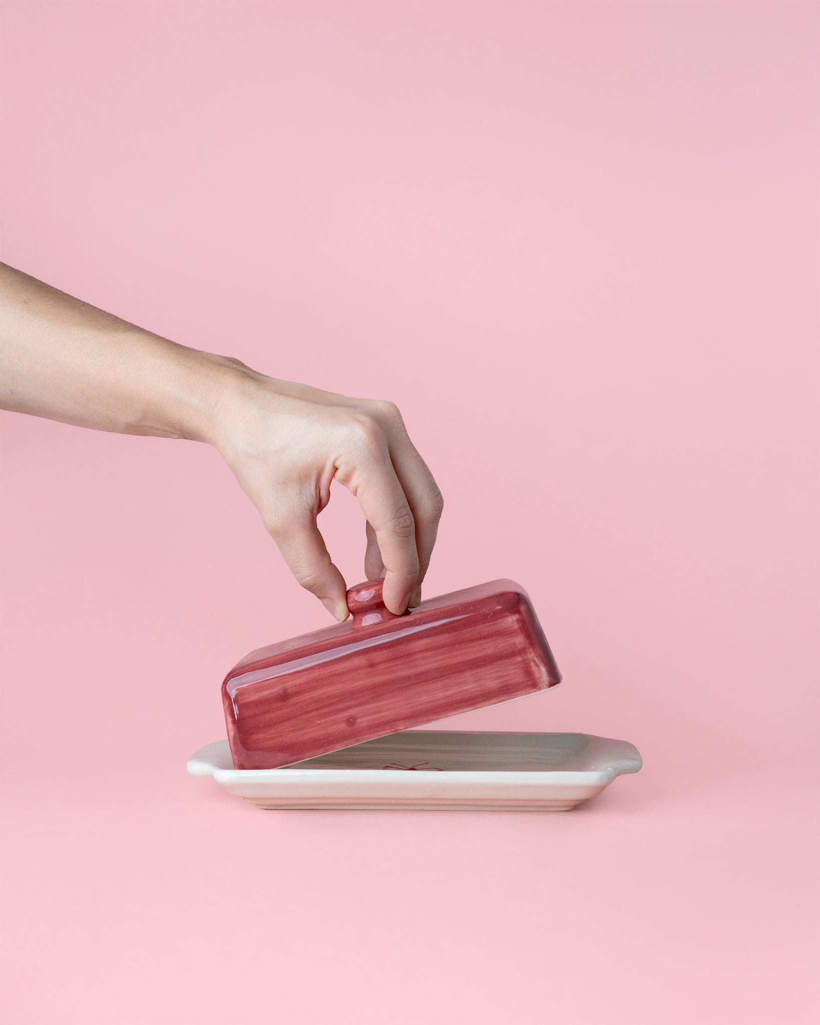 Su diseño con un detalle delicado de lazo pintado a mano, le da un aire festivo, acogedor y lleno de ternura. Es perfecta para conservar la mantequilla de forma elegante, pero también para usar como joyero, para pequeños aperitivos o simplemente como un objeto especial con historia.