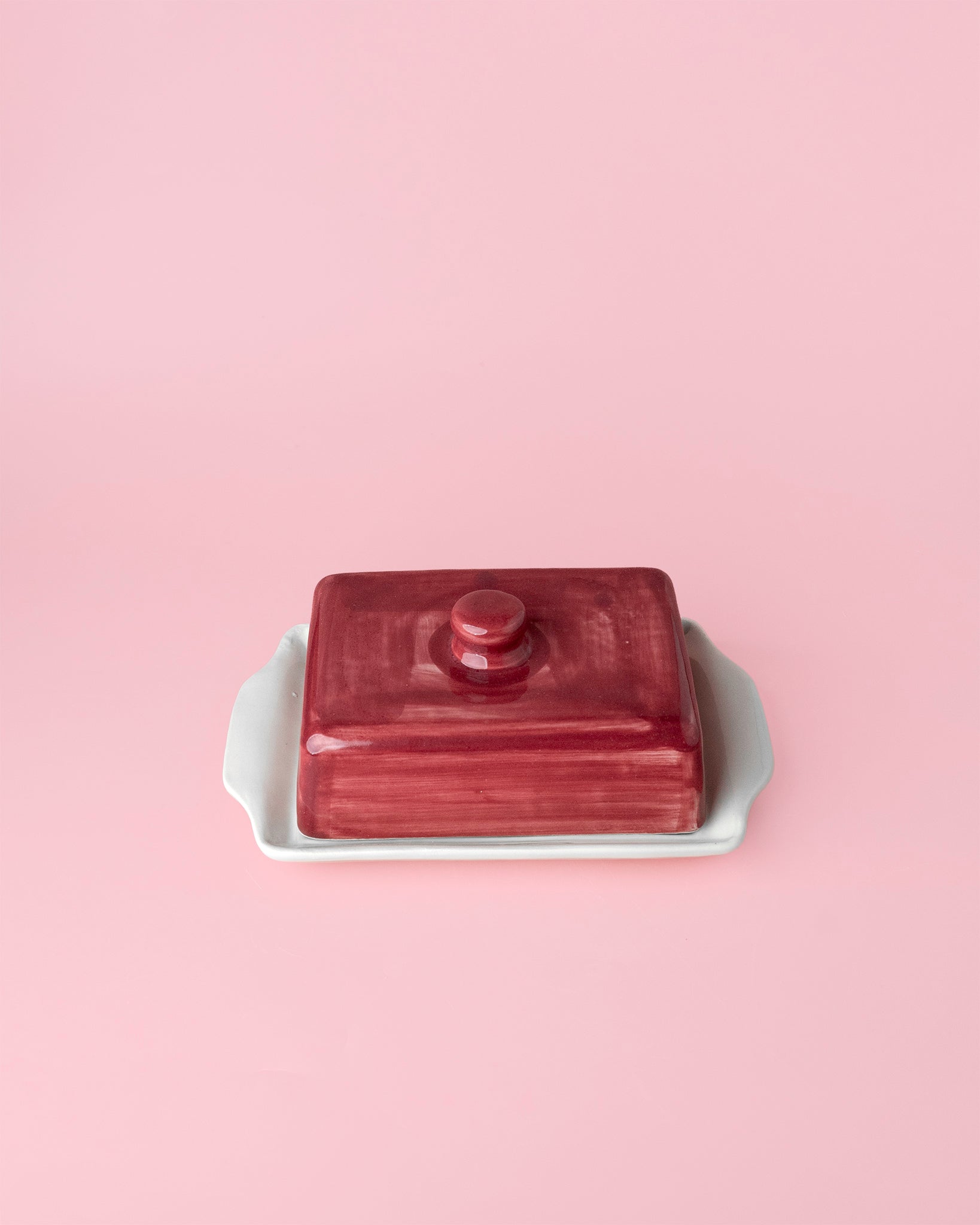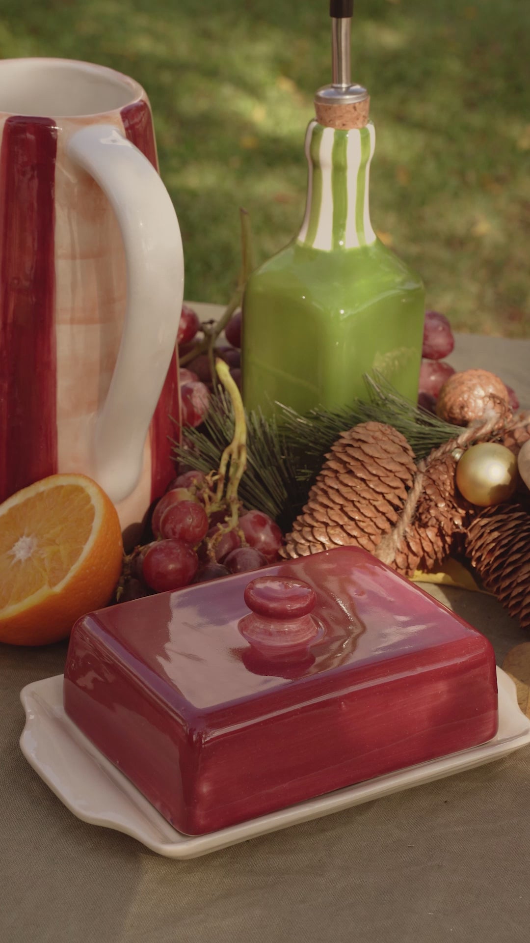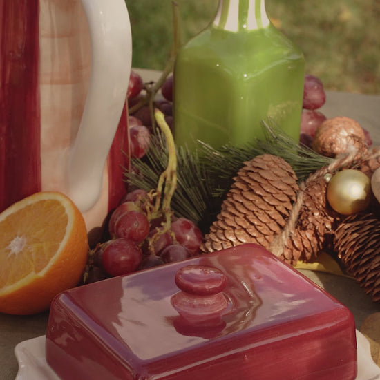 Hay piezas que alegran la mesa solo con estar. Esta mantequillera de cerámica forma parte de nuestra colección navideña Noelle y está hecha y pintada a mano en España en tonos burdeos y beige.
