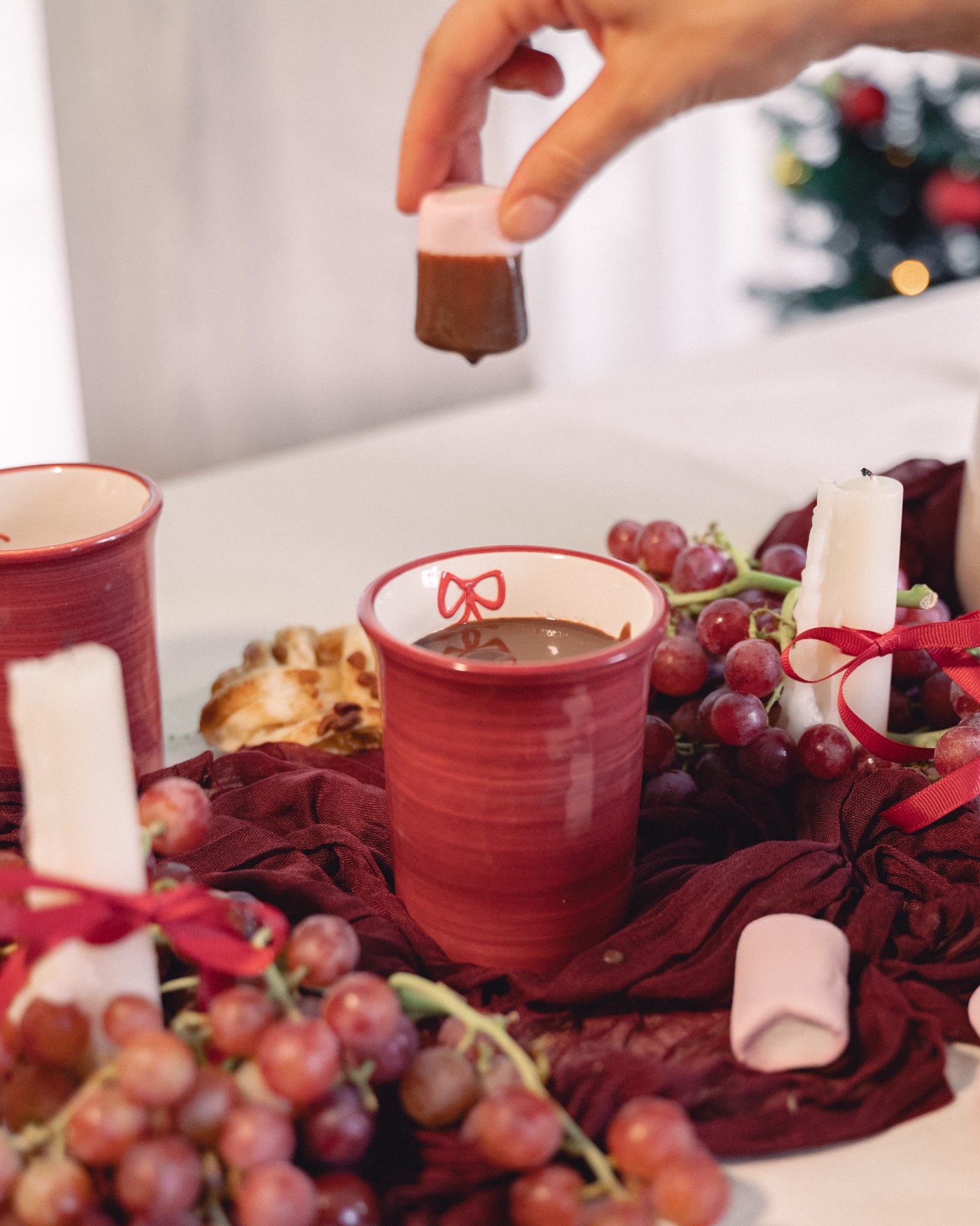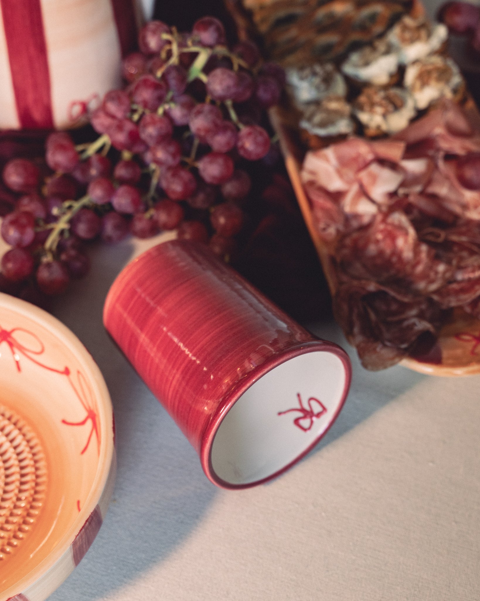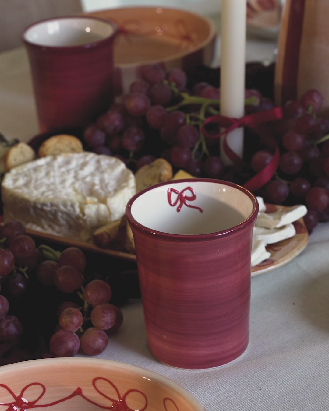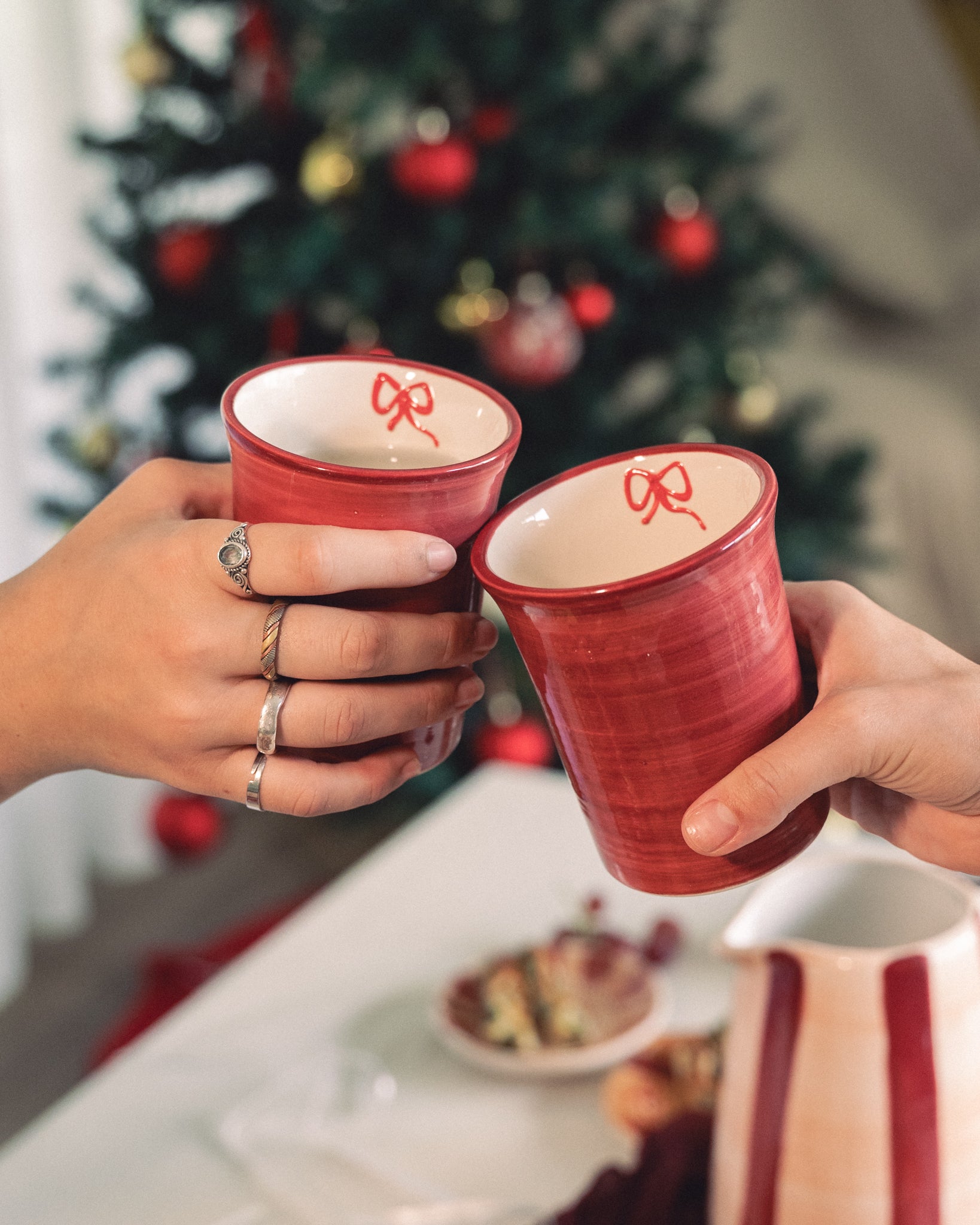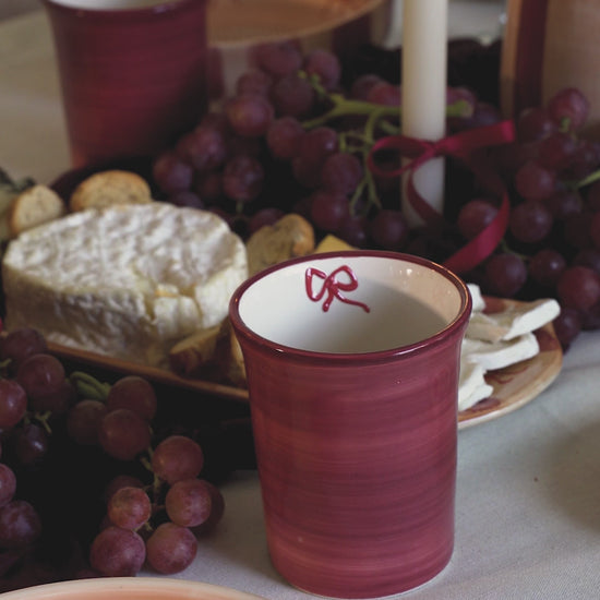 Añade un toque cálido y festivo a tu mesa con nuestros vasos de cerámica de la colección Noelle, hechos y pintados a mano en España. Su interior blanco contrasta con el exterior burdeos, y el detalle del lazo pintado a mano en el borde interior les da un aire delicado y muy especial.