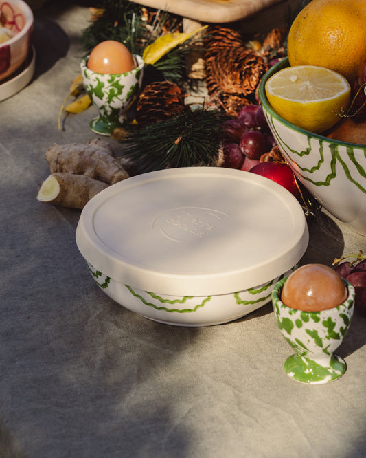 Su interior en verde jade aporta elegancia y frescura a la cocina, mientras que su diseño con borde decorativo y acabado brillante lo convierte también en una pieza preciosa para presentar aceites aromatizados o servir en la mesa directamente.
