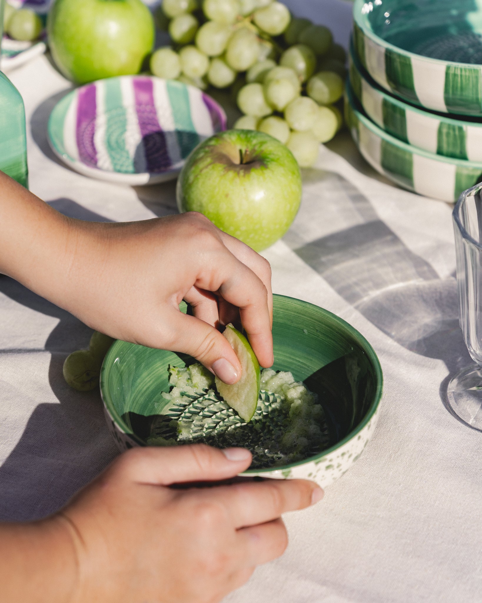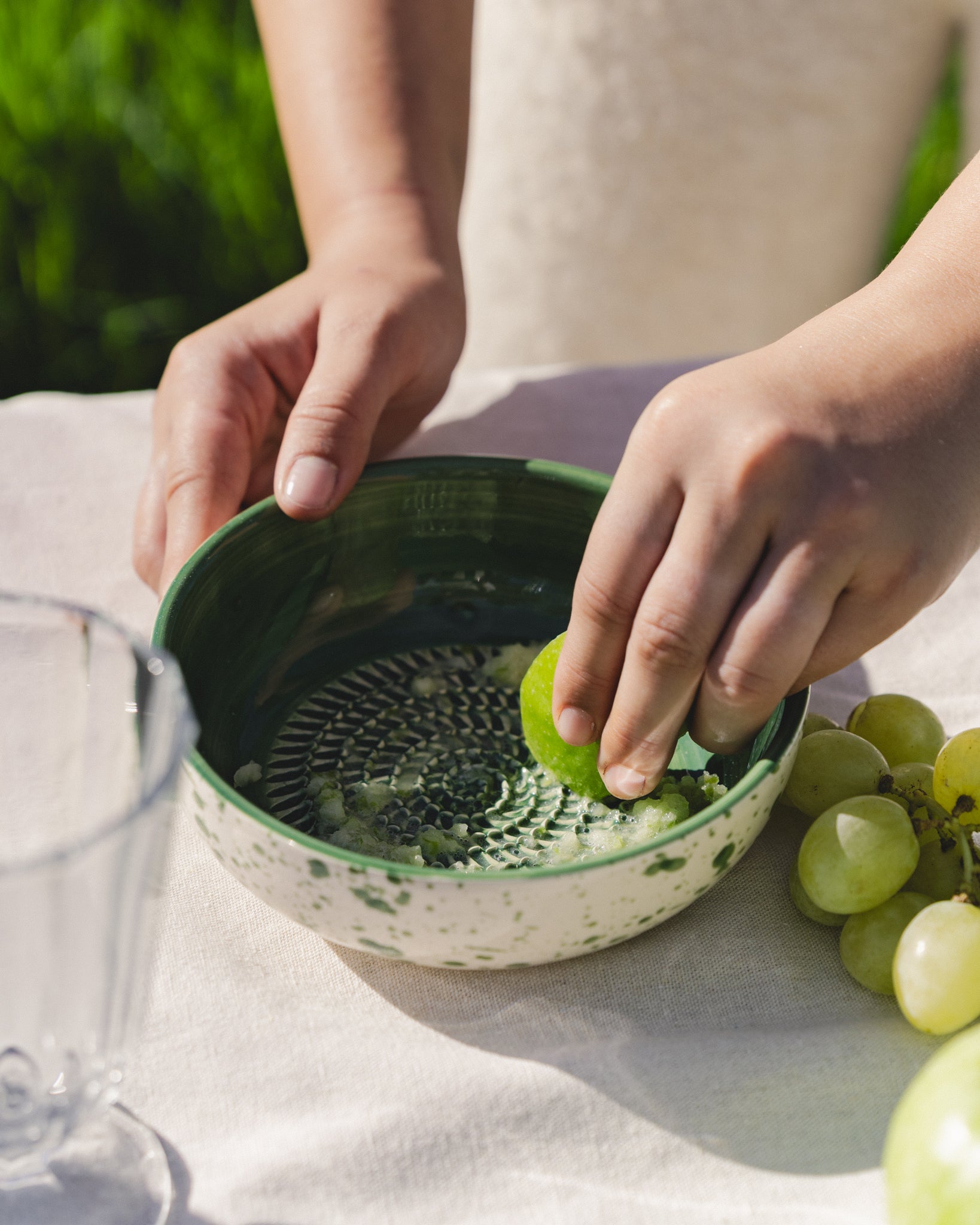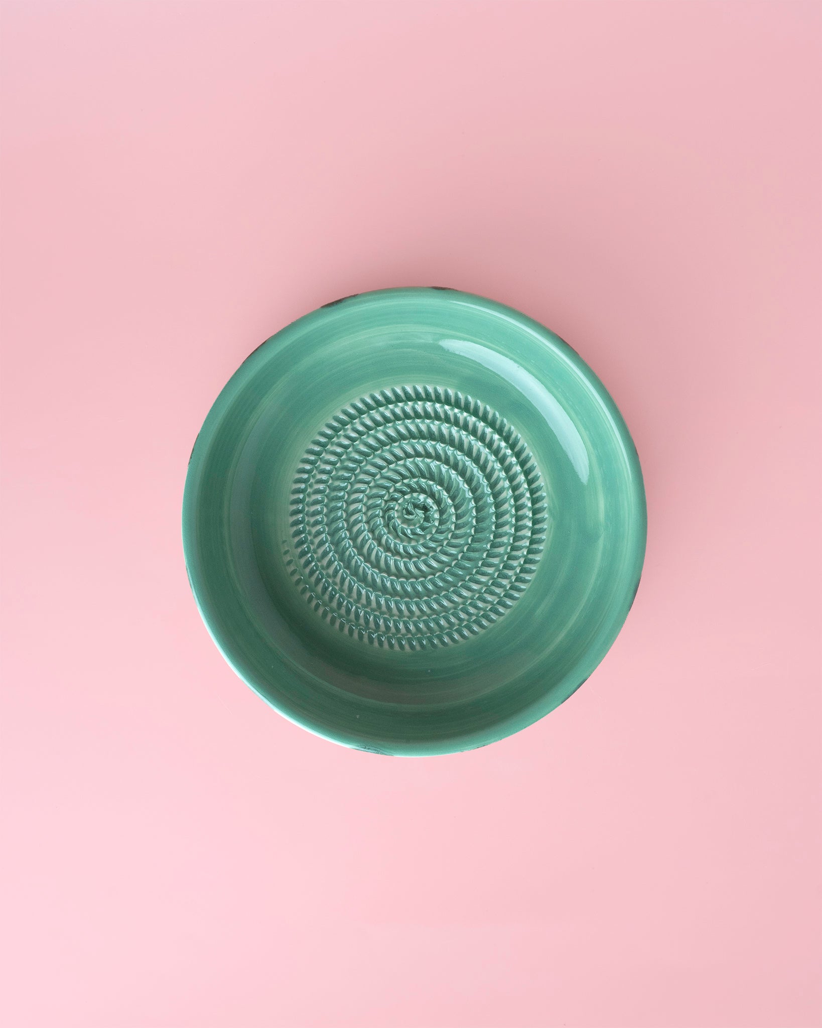 Nuestro plato rallador Jade combina belleza artesanal y funcionalidad en una sola pieza. Hecho y pintado a mano en España, su superficie en relieve permite rallar con facilidad ajo, tomate, jengibre, queso o incluso chocolate, sin necesidad de cuchillas ni esfuerzo. Ideal para preparar aliños, salsas, adobos o bases de guisos de forma práctica y segura.
