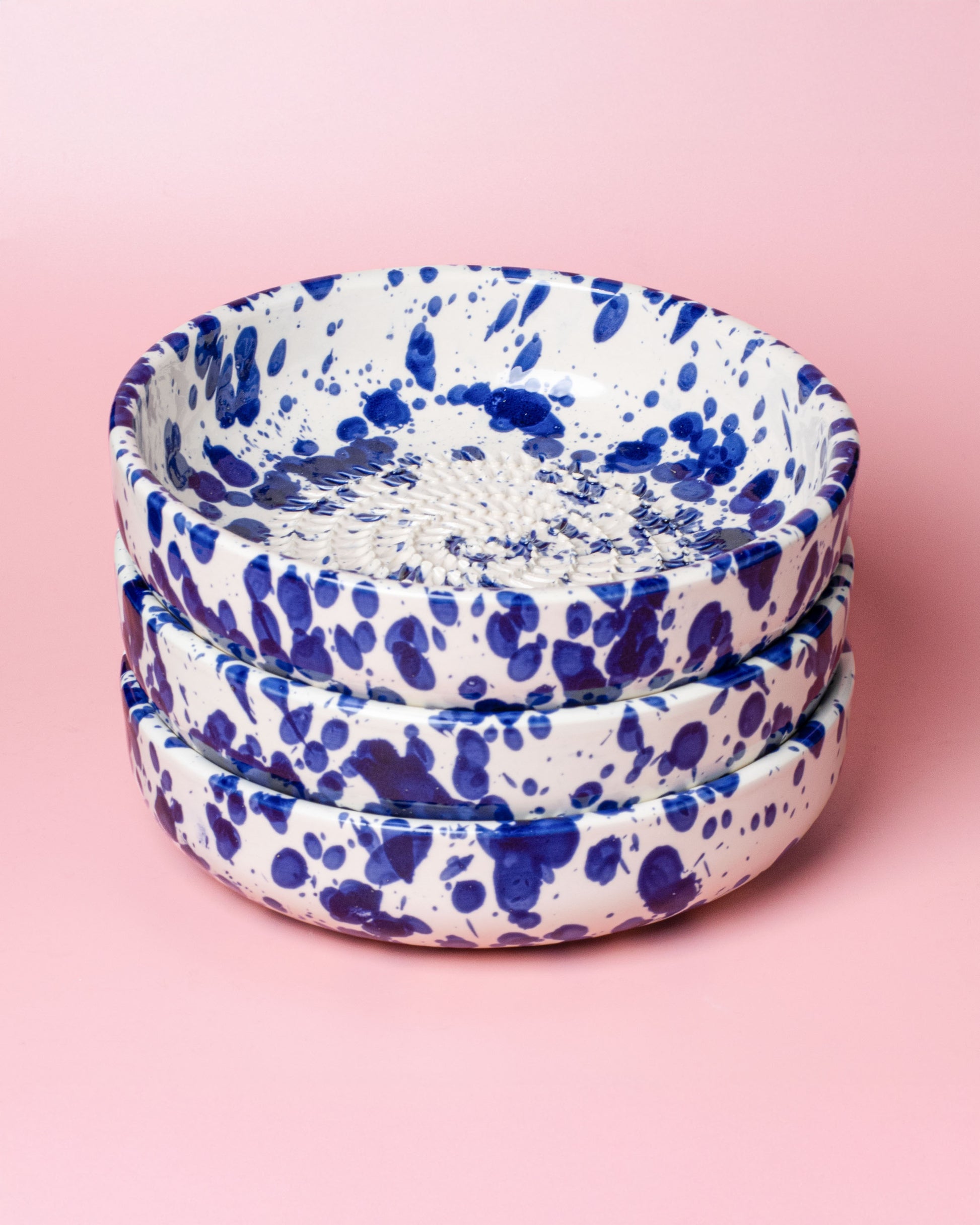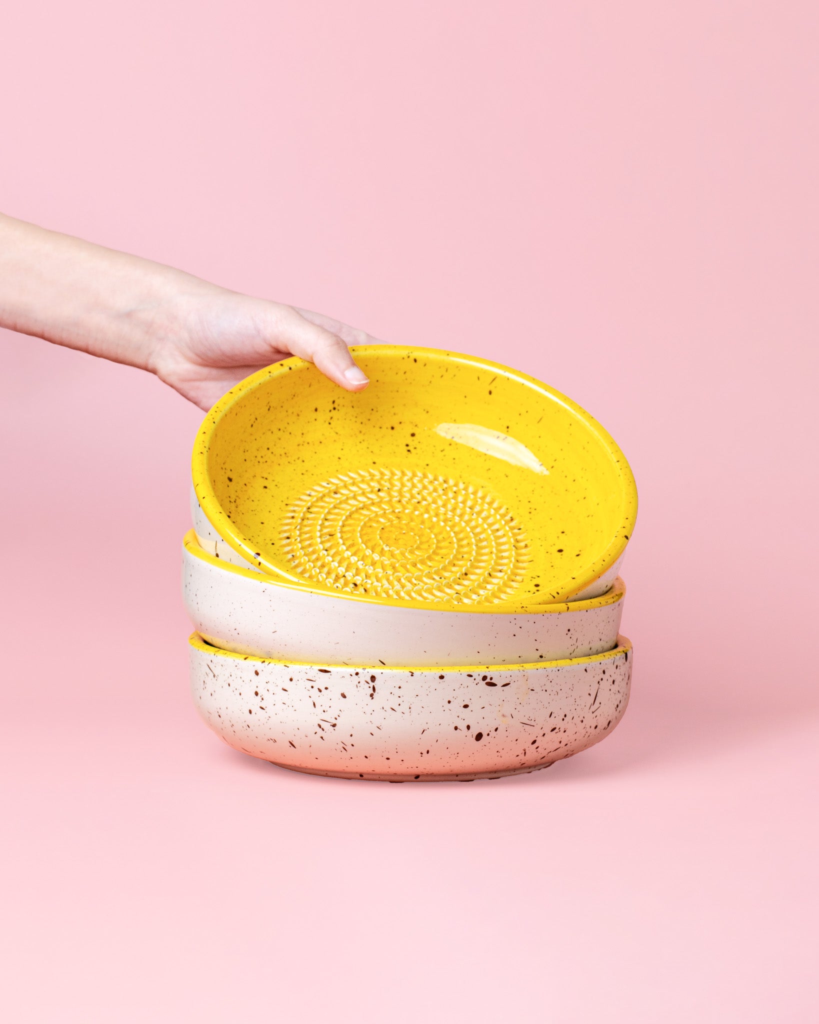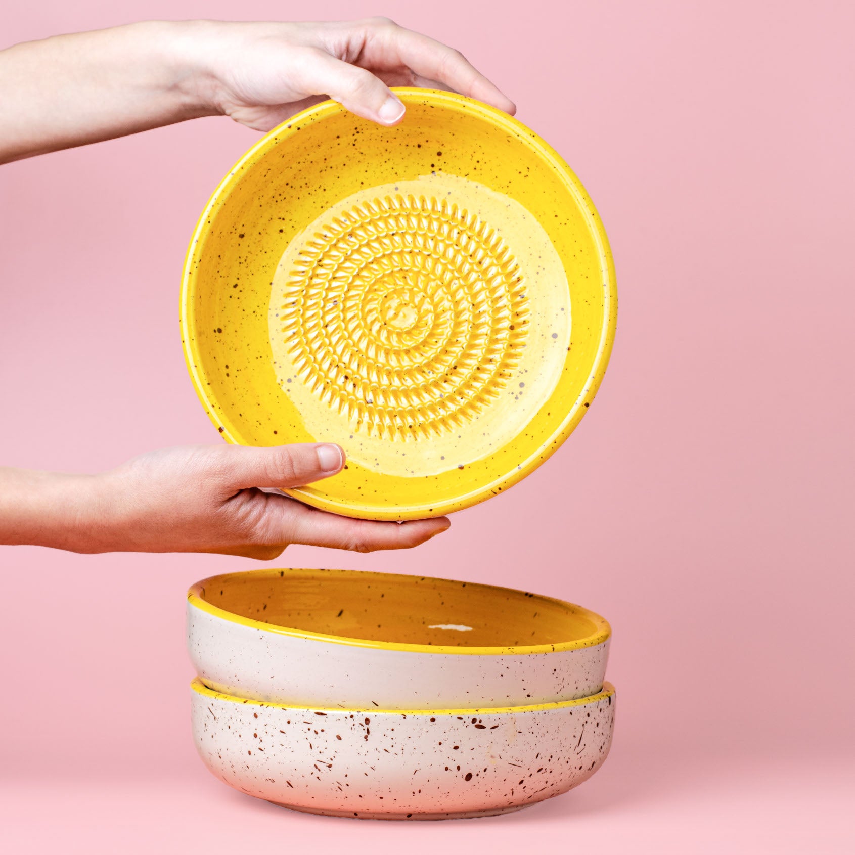 Nuestro plato rallador de cerámica artesanal hecho y pintado a mano en España, es el compañero ideal para darle vida a tus desayunos rallando el tomate y el ajo para tus tostadas, o para añadir ese toque especial a tu pasta con un poco de queso parmesano. Y para los más dulces, es perfecto para rallar fresas para un postre exprés.