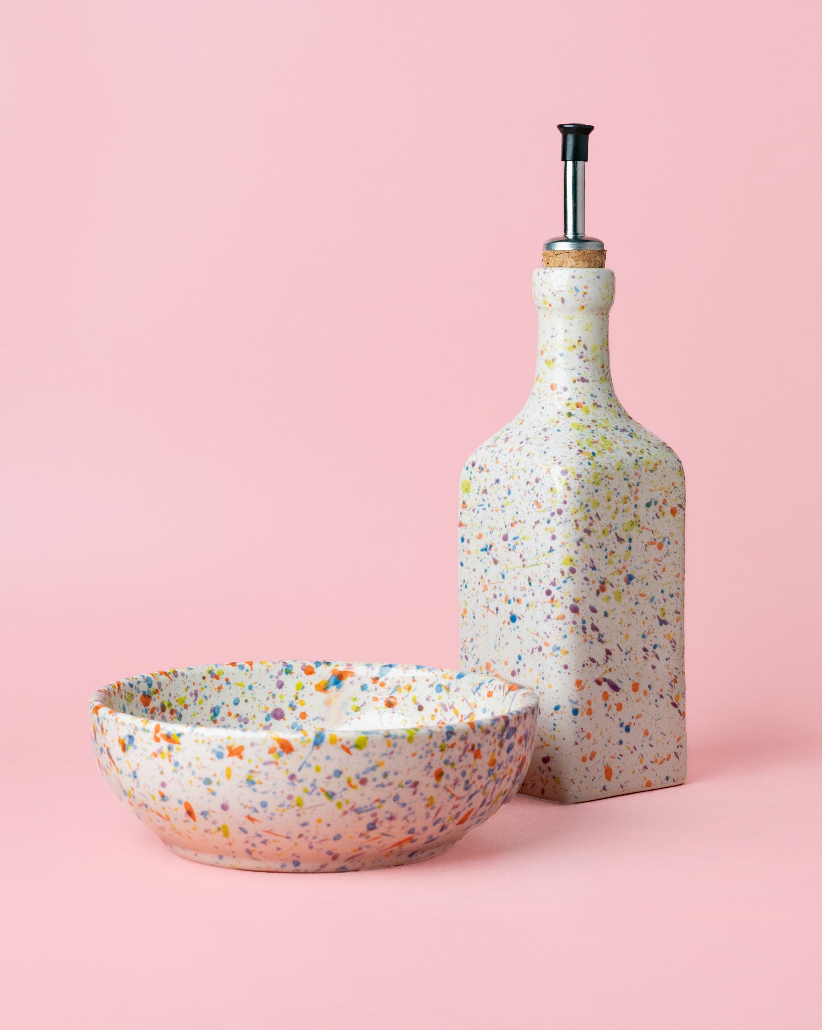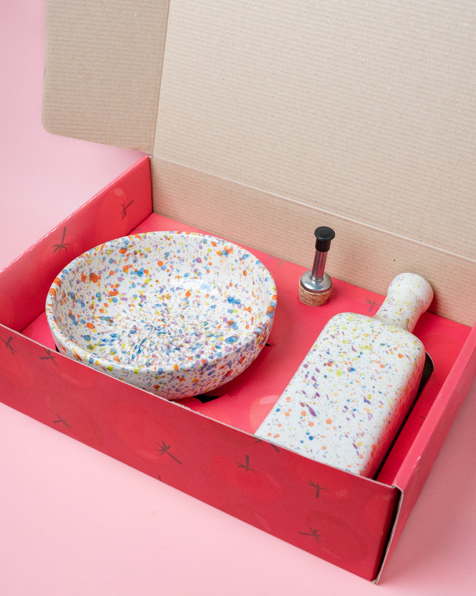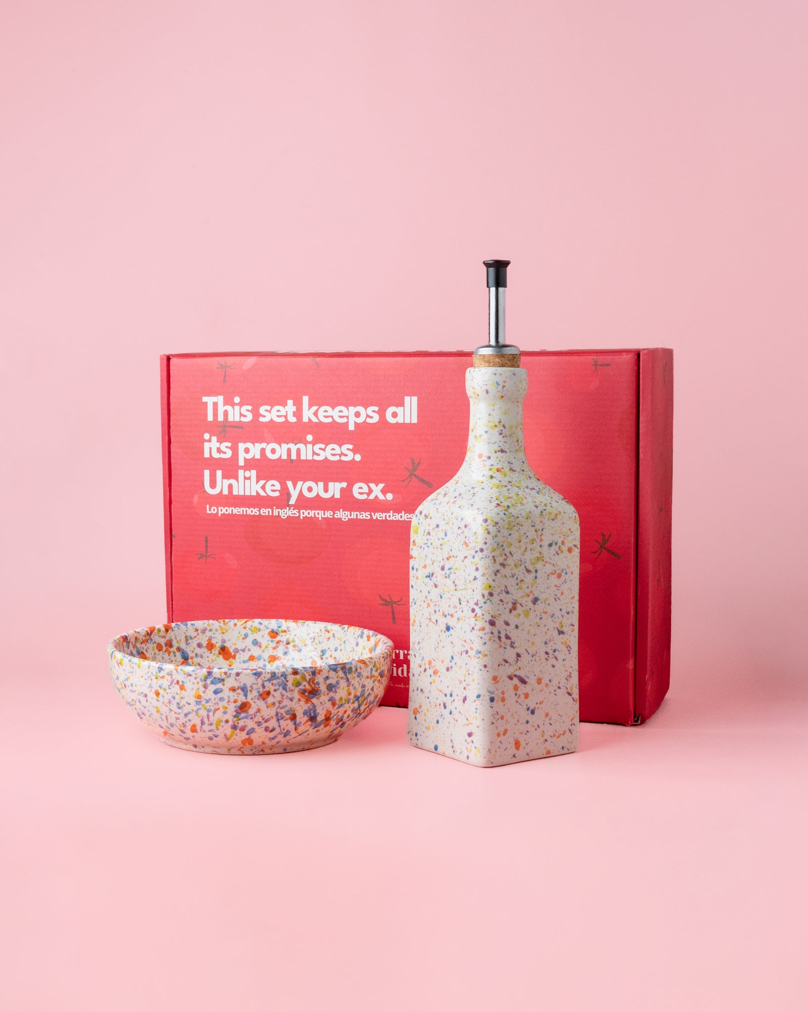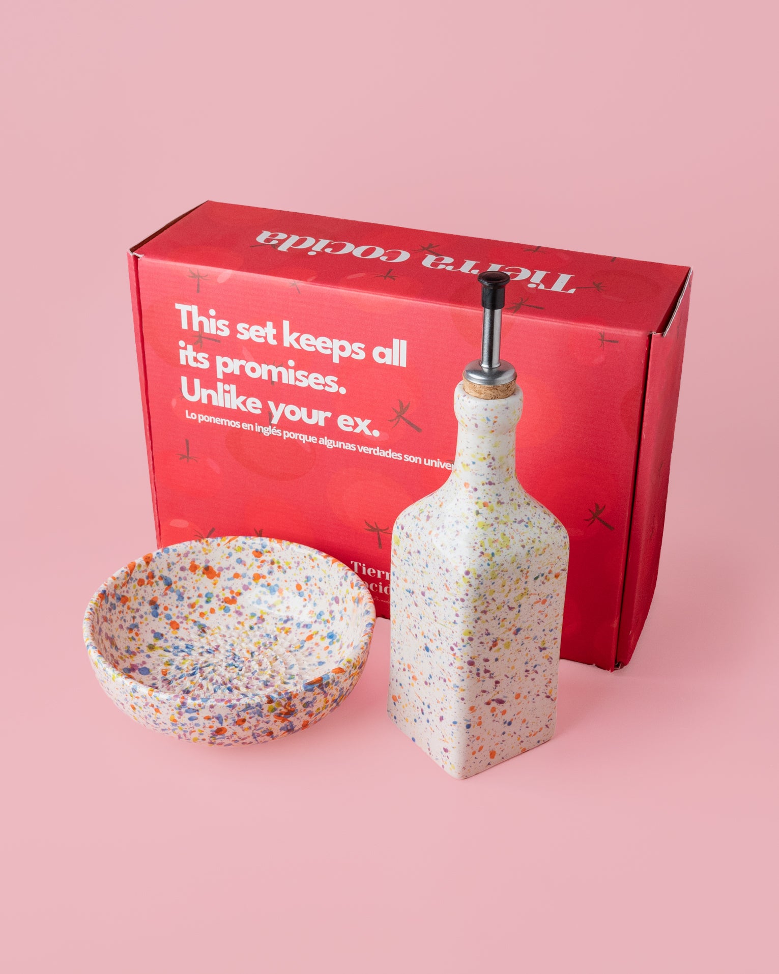 Este set incluye: Plato Rallador Mediano Carnaval + Aceitera Coral + Packaging
