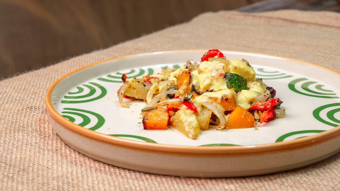 4. El toque final: Sirve las verduras recién horneadas acompañadas de la salsa probiótica. Puedes decorarlas con un poco de hierbas frescas para un extra de sabor.